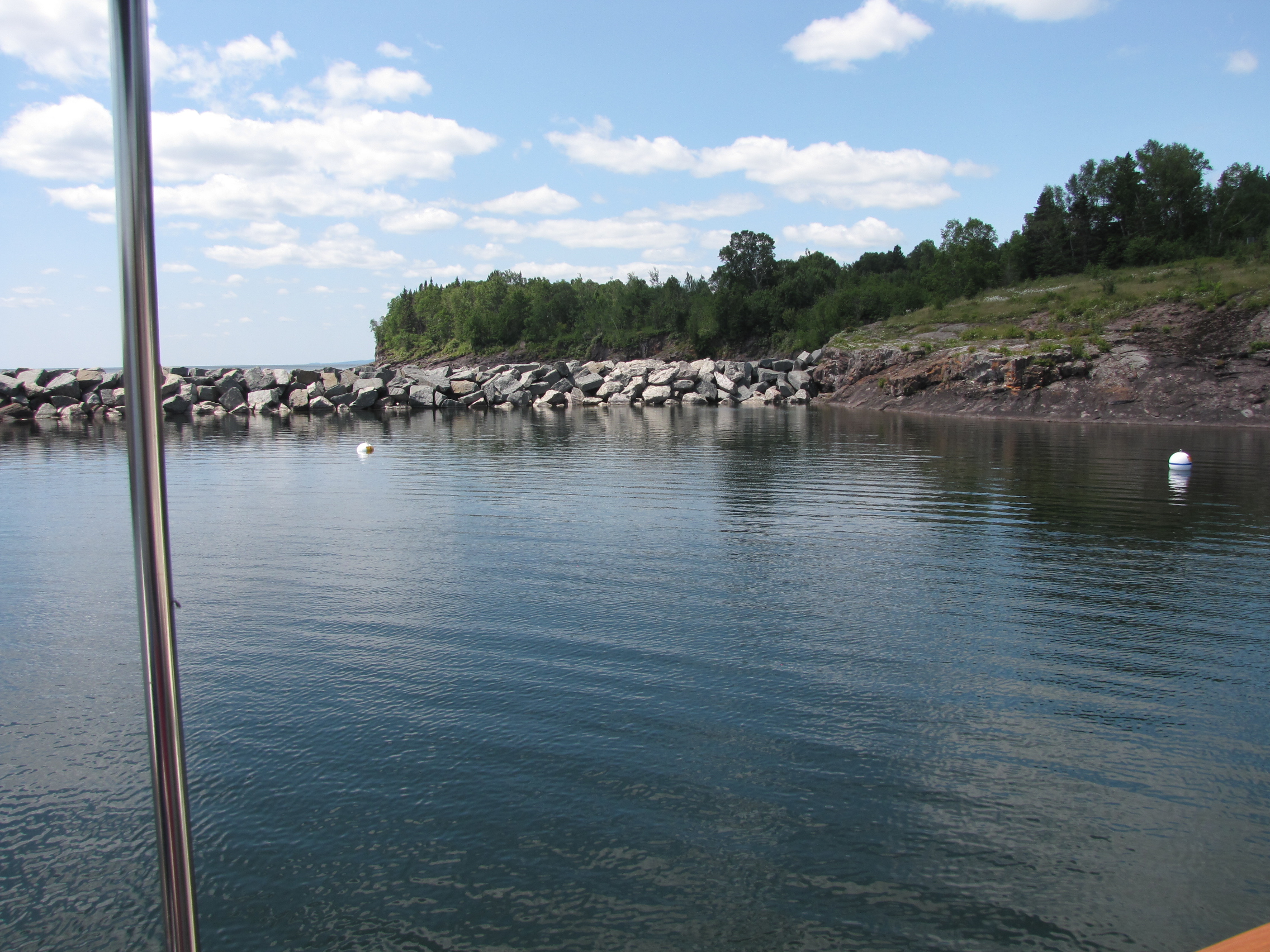After fueling and a pump out on Tuesday morning in Silver Bay , we set off for Taconite Harbour, which was 25 miles away, passing by the Pallisade Rock, with the tower on it. The wind was going to increase in the afternoon, so this would be far enough for us. The refuge harbour consisted of 3 mooring balls surrounded by a break wall. No wind issues here. We selected the closest mooring ball to the entrance, and tied off. One minor casualty- I broke the end off Andy’s locking hook, while pulling it out of the mooring ball loop. (He’s hoping that someone with a 3-D printer might be able to make him a new one.)