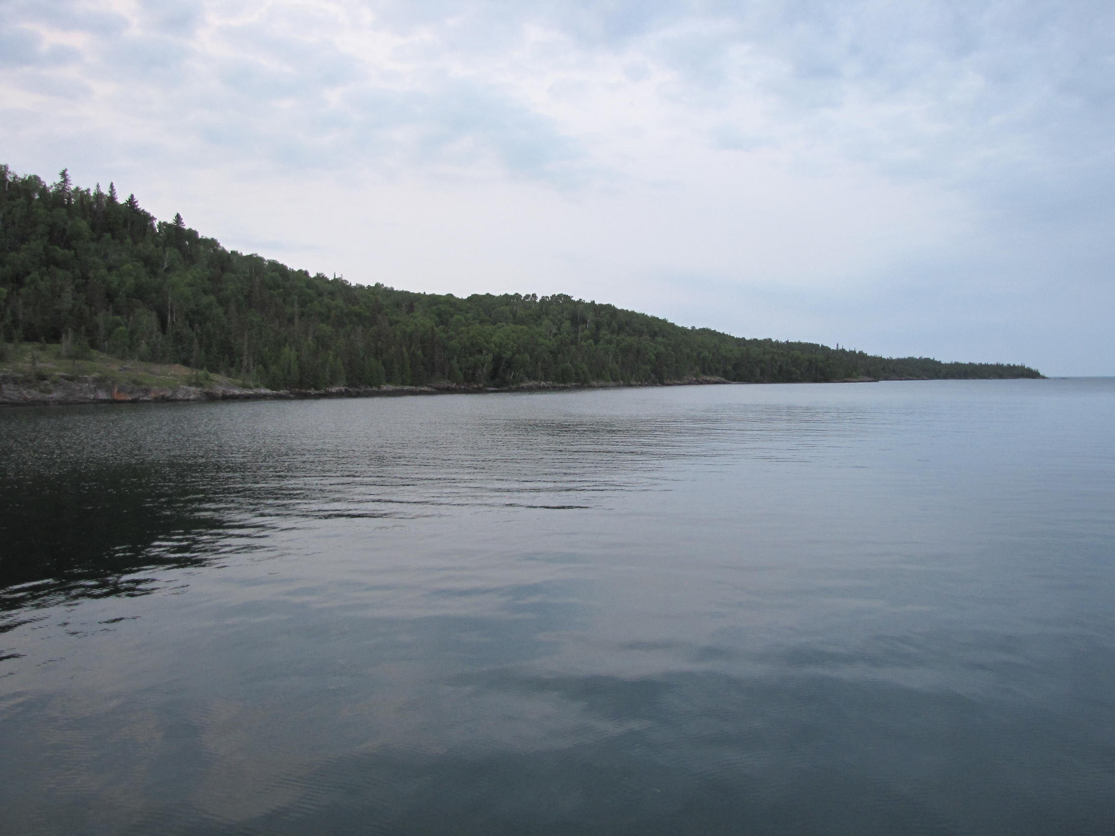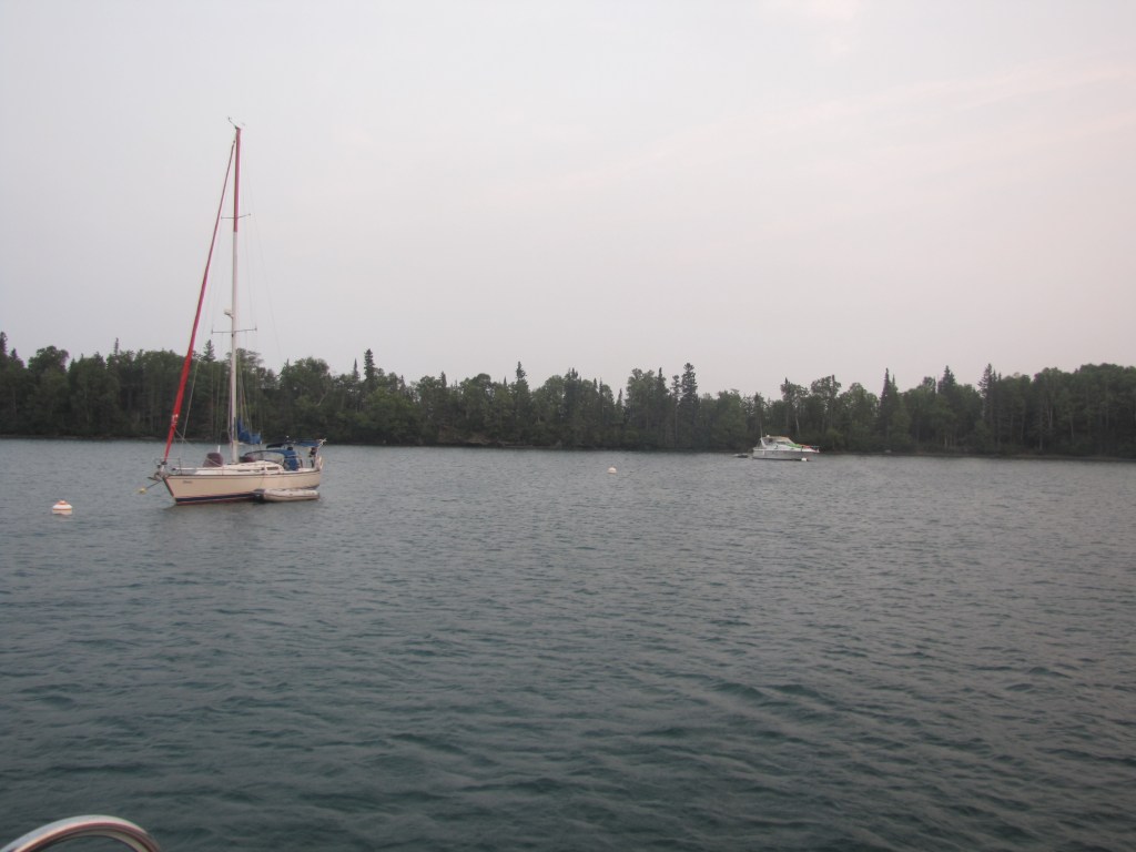 We went around the point and anchored in 15 feet of water, it was overcast, with a slight breeze. We called the Canadian Border Security Agency to report that we were back in Canadian waters and at anchor. We were given a clearance number that can be used until we land in Thunder Bay, provided we don’t go ashore.