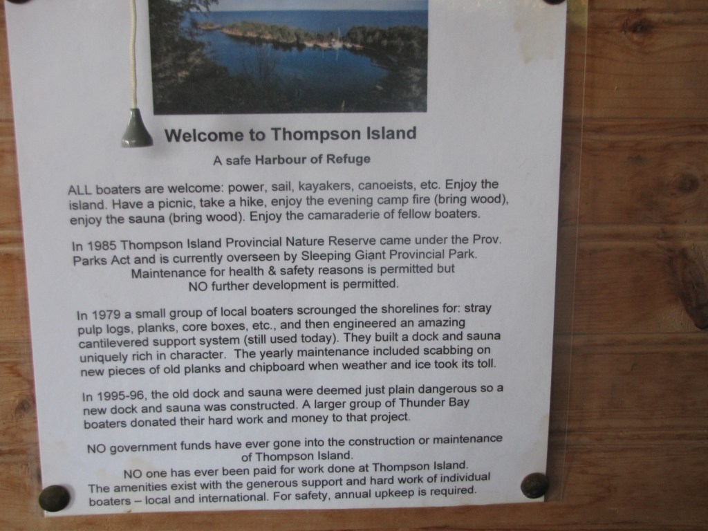 We had read about Thompson Island, were residents from TBay had set up a community in the 1970’s. This site is in a long Bay- called Wray Bay, and has docking, a shared BBQ area, Sauna building and outhouse, and here it is OK to raft boats together. When we arrived the only space available was too shallow for us, so one of the boats- Piper, allowed us to tie up to them. There was a sailboat ahead of them that was going to leave in the next hour or two – so we could have their space. Once the sailboat left, Piper moved up, and we took his space instead. When Piper left a little later, the space was filled by Knot Today, a 50 foot Bay liner, owned by Tim and Susie. We later learned that Susie’s parents were some of the people that developed this site. In talking with them further, we discovered they were planning to do the Great Loop in a few years—so they had some questions about it. Susie had asked some questions about charts—which provided us with the opportunity to share some of the dead weight that was taking up space in our hanging locker. We gave them all the charts for Florida and the East coast, as we had already given the Rivers charts to Princess Margaret earlier in the week. We went for a short hike to the rock shore on the other side of the island and spent a pleasant Sunday night on the dock. On Monday morning 3 of the boats left, so we decided to stay one more day. We did some cleaning and re-arranging on the boat, and started packing up stuff to take home to Winnipeg. On Monday night the wind picked up a bit, and we had some waves in the Bay. In the evening, we saw Tim flying a drone, so Andy pulled his out—which he had never got working, and Tim was able to figured out the software, and help him to send it on its maiden voyage. Tim advised not to run it from the boat, only on shore. After the boys were done playing with their toys, we partook in a Thompson Island tradition, and went for a sauna.