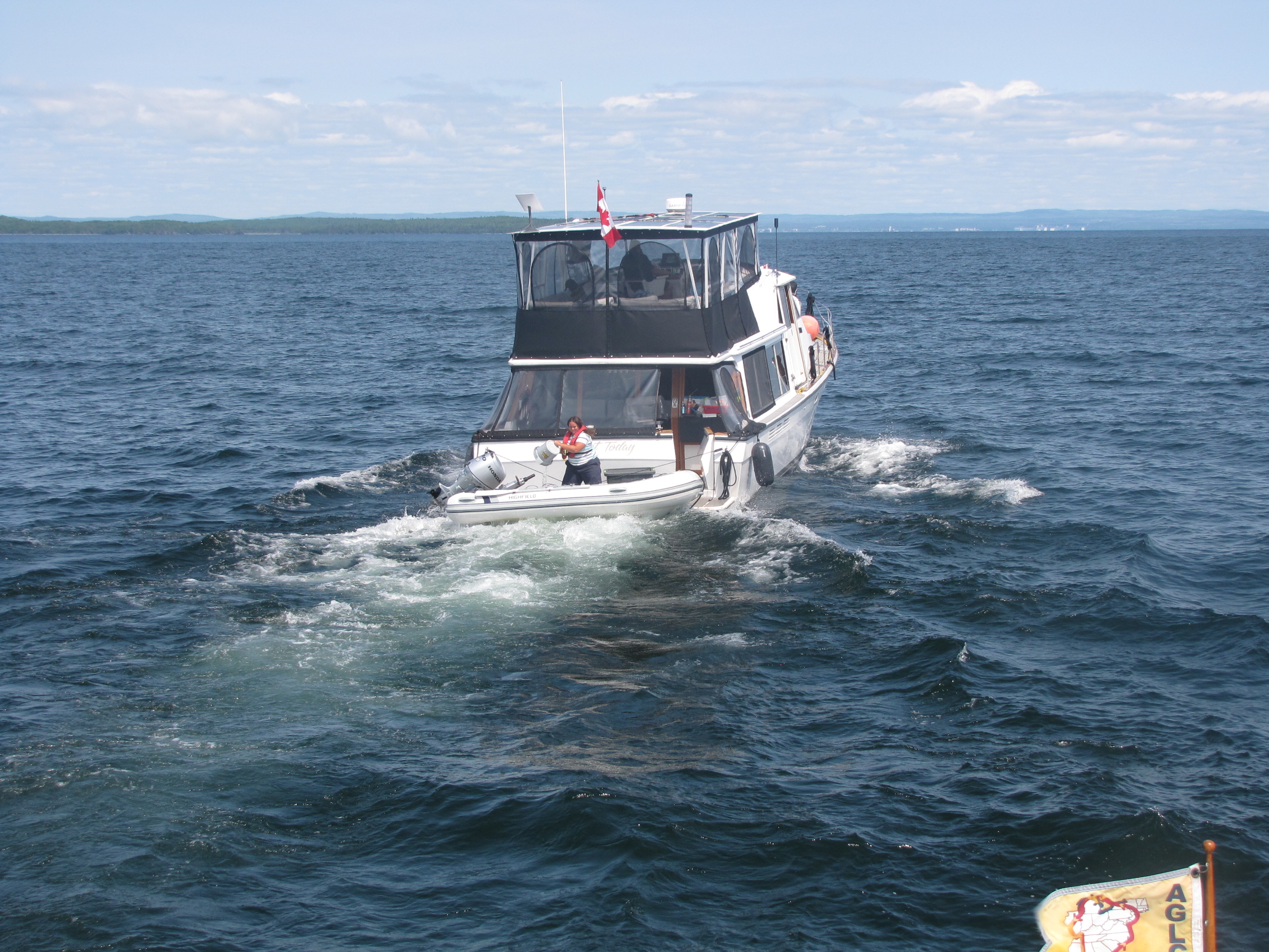 We were on the wrong side of an island and encountered a rock shoal. Not good! Andy called Tim, who found us someone in Rossport, that would come out to pull us off. While we waited, both Andy and I got into the water. How many people can say they walked around their boat in Lake Superior—The stern of the boat was in about 3.5 feet of water, but the bow was in about 2.5. There was nothing Andy and I could do to move the monster. Chris and his son Peter arrived around 2:15 with a boat with a 90HP motor, after a few attempts with a single rope, we both put bridles on and he was successful at pulling us off. We followed him to Rossport to assess the damage. No water was coming in, however there was a vibration. Peter took a couple pictures of the props, and they were still there. We tied up Rossport- not knowing what to do- a sleepless night, because of worry, trains, wind and waves.