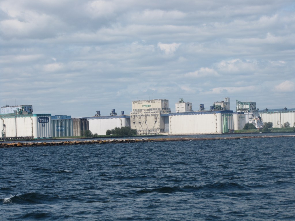 On Tuesday morning, Andy helped Tim clean up the sauna area, and then they burnt some boxes. Just a small fire. Around noon, it was time to take off and head to Thunder Bay, with the wind and waves, still coming from the East, there was still some big waves out in the Bay. We followed Knot Today, through the Thompson Island gap, and waves were a little less on the other side, we continued on passing by Pie Island. A couple of times, Knot Today, slowed down, so they could bail out their dinghy which was filling up with water. As we approached Tbay, we could see the sleeping giant, once we were through the break wall, the grain elevators were all visible on shore, many of them with names on them- that no longer exist- like Agricore United.