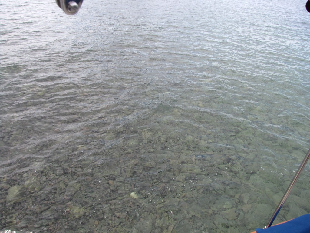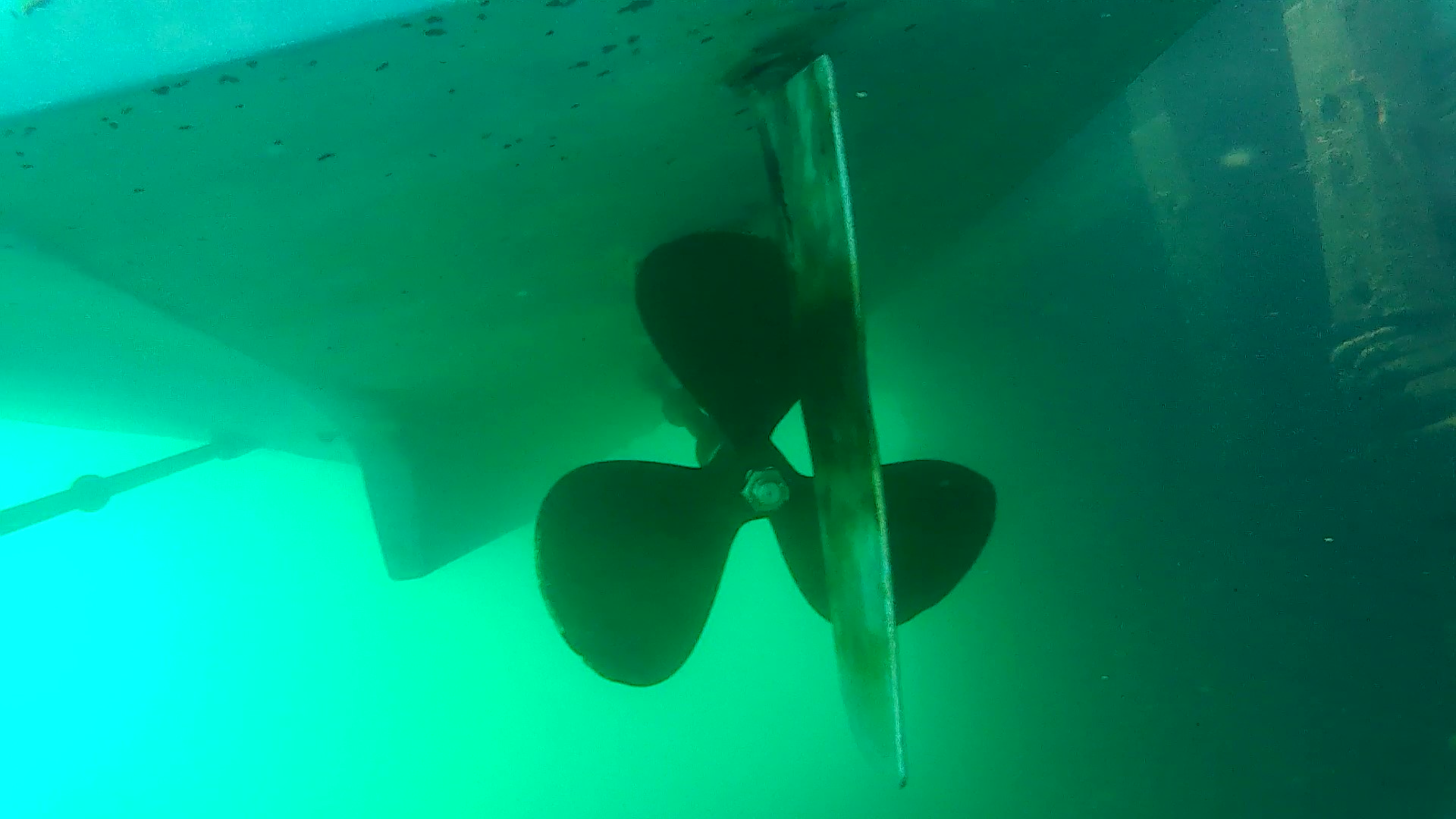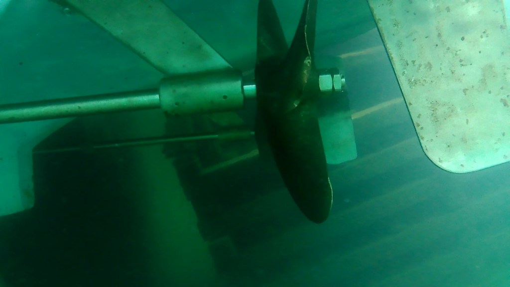 In the morning, Jack our techno grand kid was able to get our Safaire camera working and took an underwater video, confirming that the props and rudders were intact, but each of the 6 flutes had some damage- the port prop seemed worse than the starboard.