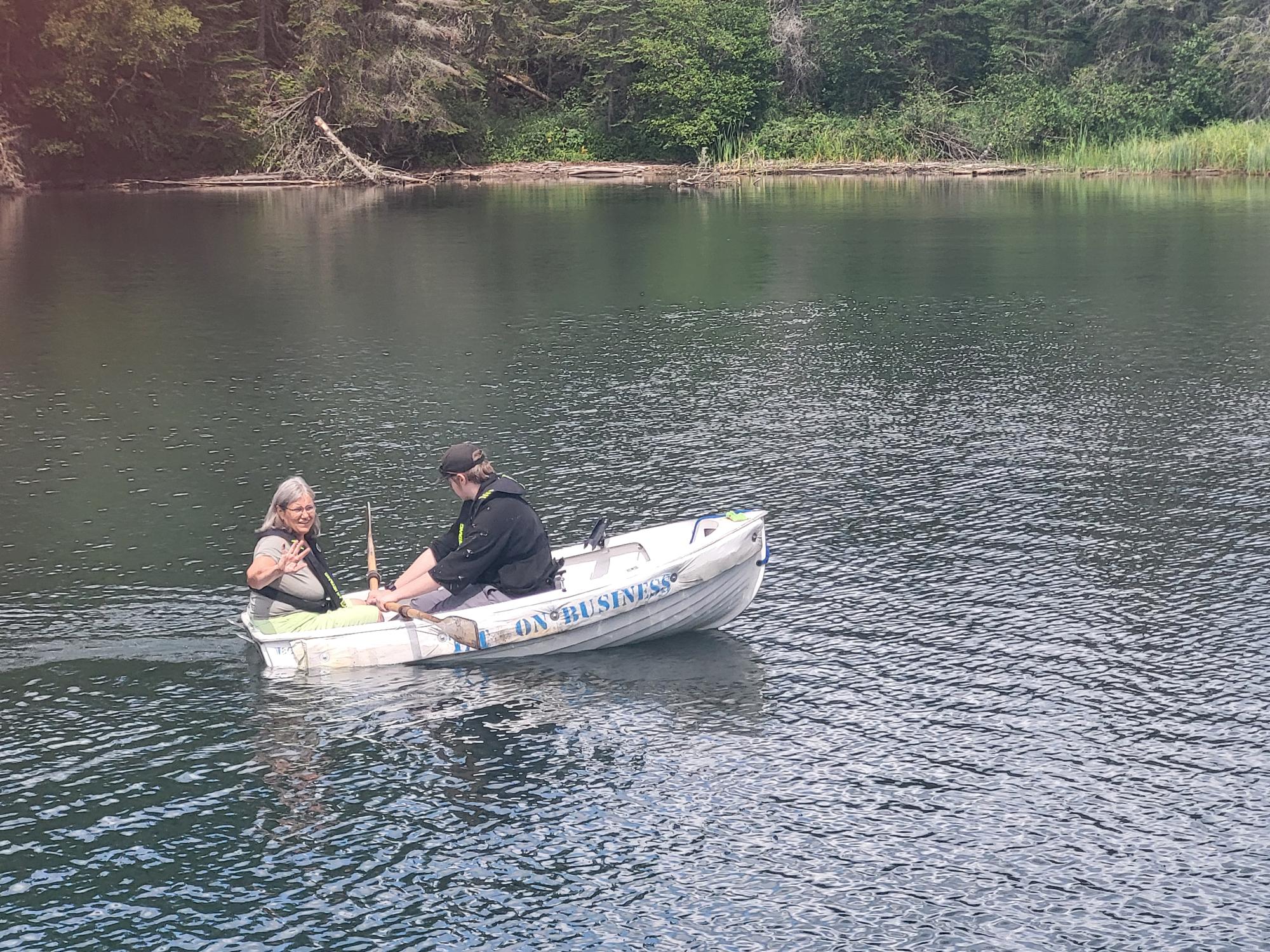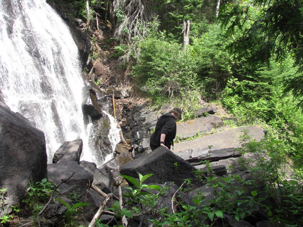 On Saturday afternoon, we moved 12 miles to Otter cove, where we had read there was good fishing, a moose feeding ground and a waterfall. When Andy did the fuel check he noticed that we were not using any fuel on the starboard side- and realized that the return valve between the engines was shut off. Andy opened it so that the tanks could equalize. We spent the day doing cleaning in some of the storage lockers. On Sunday we moved a little farther down the bay. In the afternoon, we launched the dinghy, I had planned to row Jack and I to the waterfall. Although I work out on the rowing machine at the apartment block—the movements of doing it in a boat are quite different—I was pathetic, and we went around in circles. Jack and I switched places and he rowed us to the waterfall—the last 100 feet was very shallow, with lots of logs underwater. Jack got us there – and I didn’t even get my shoes wet. We trekked through the paths, found the waterfall, and I took some pictures.