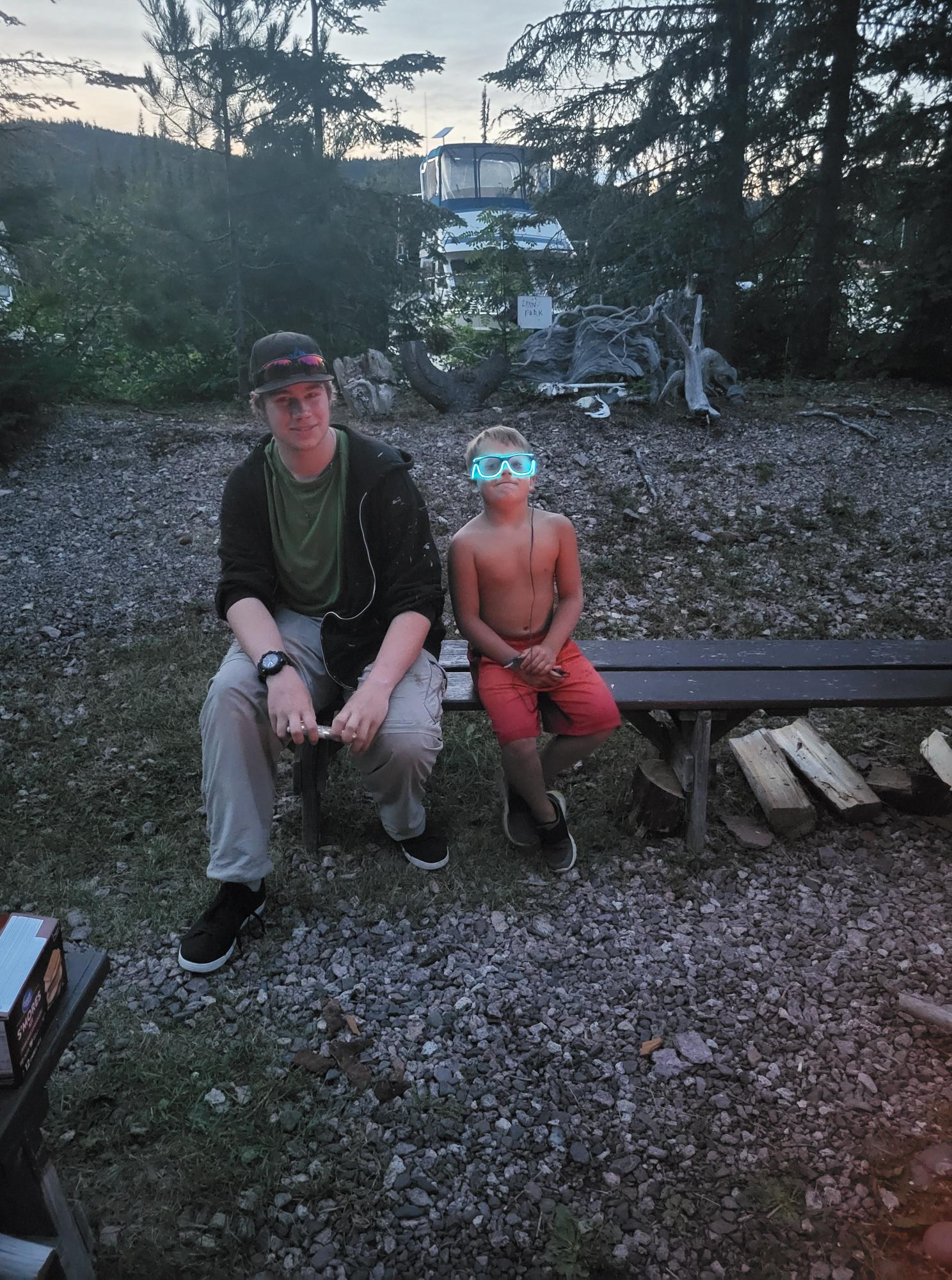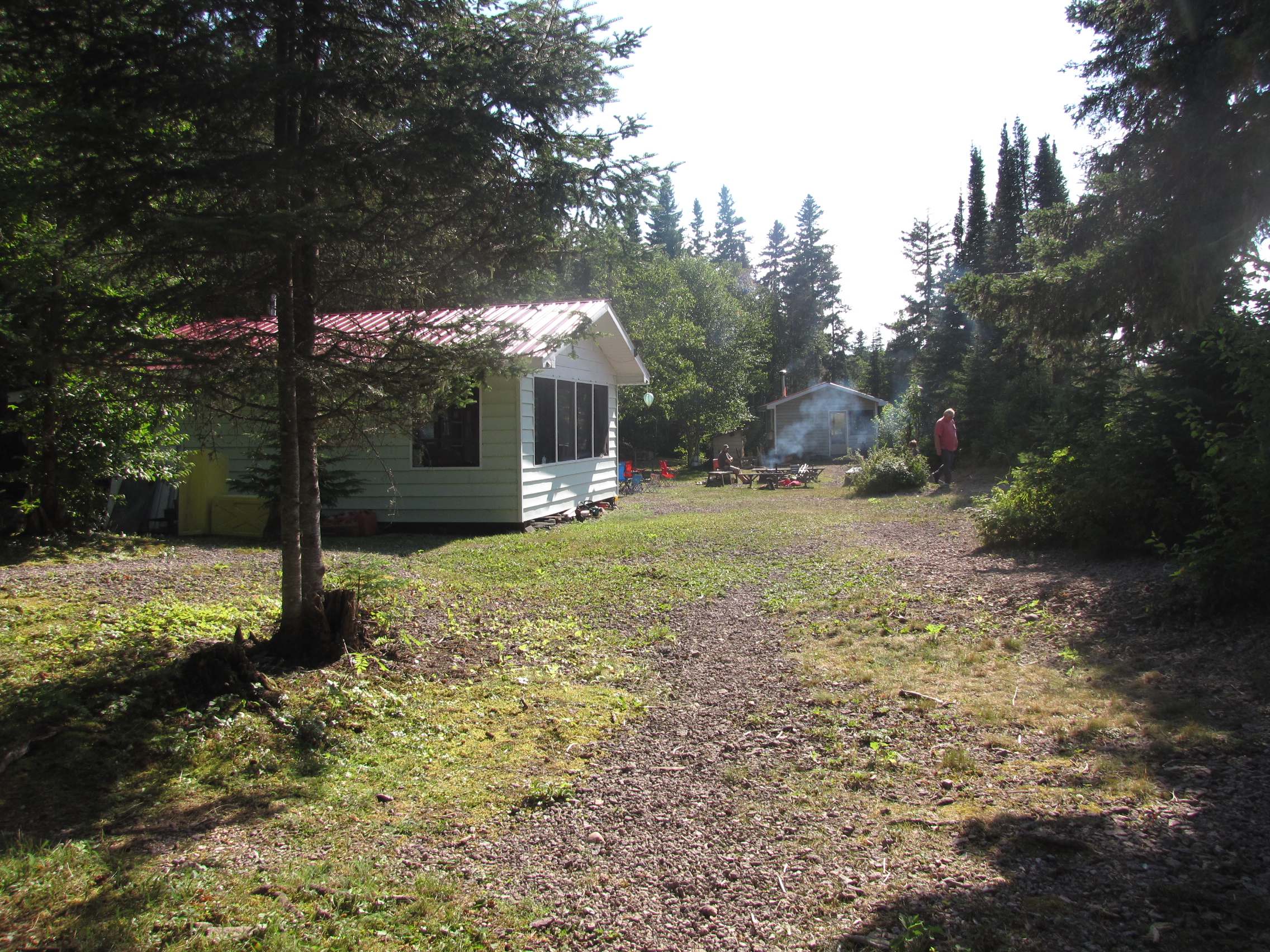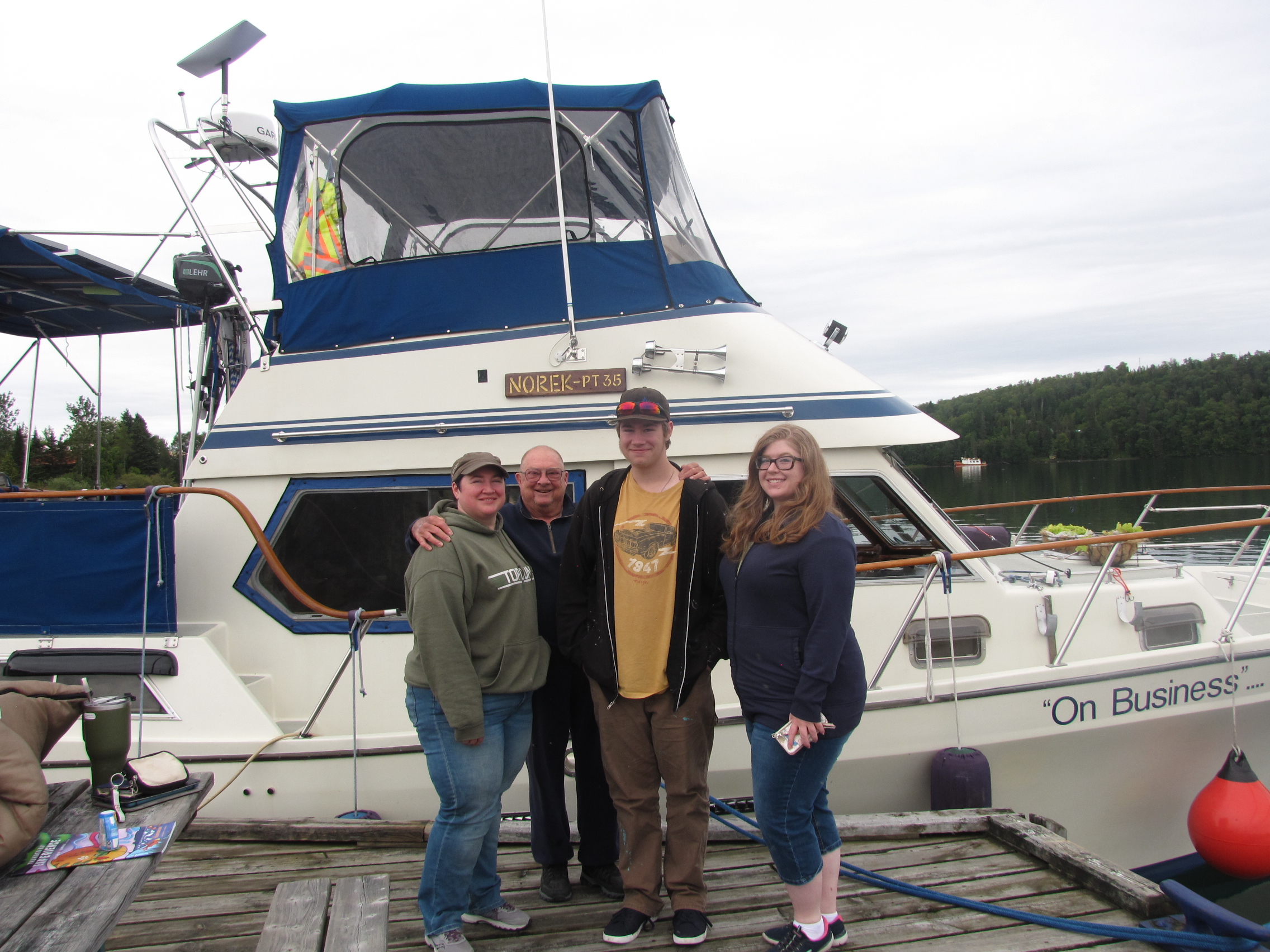 On Tuesday morning, after showers, Jack and I walked into town to reprovision at the grocery store, Andy asked Bev from the marina if she could find a home for a rusty anchor and some chain, we also wanted to dispose of the useless battery. Both items were taken from the boat. On our return from shopping, we moved the boat to the fuel dock and topped up the tanks. We then departed, going back down the Nipigon channel and around Fluor to anchor or dock at CPR slip on the east side of St. Ignace Island in a very secure bay. We were told that the area had been excavated years ago for the ballast used along the CPR lines. This place was similar to what we had experienced at Thompson Island a few weeks back—the island is privately owned, has a lounge area/bunkhouse, a shared BBQ area, sauna, fire pit, trails and several docks. Once again rafting is the norm—we tied up to a sail boat. The area is around a gravel spit and has protection from all sides. Once we were settled in, we met people from the other 9 boats, already tied up. We knew a few already–Tim and Suzie, Suzie’s sister Leslie and Chris, and her parents- Brenda and Dave. There was an 86 year old, Doug- who spends a lot of time here at CPR in the summer. There was another person, Ron, tied up on a sail boat, who actually lives at Victoria Beach, north of Winnipeg, but boats out of Ontario. Andy chatted with him for quite awhile, as he has taken his sailboat to Newfoundland, Labrador, and done most of the Down East Loop. After dinner there was a camp fire, and most of the kids made smores and played. Jack was really good with the younger children, here he is with Cooper at the campfire. Once it was dark, and the mosquitos came out most people returned to their boats.