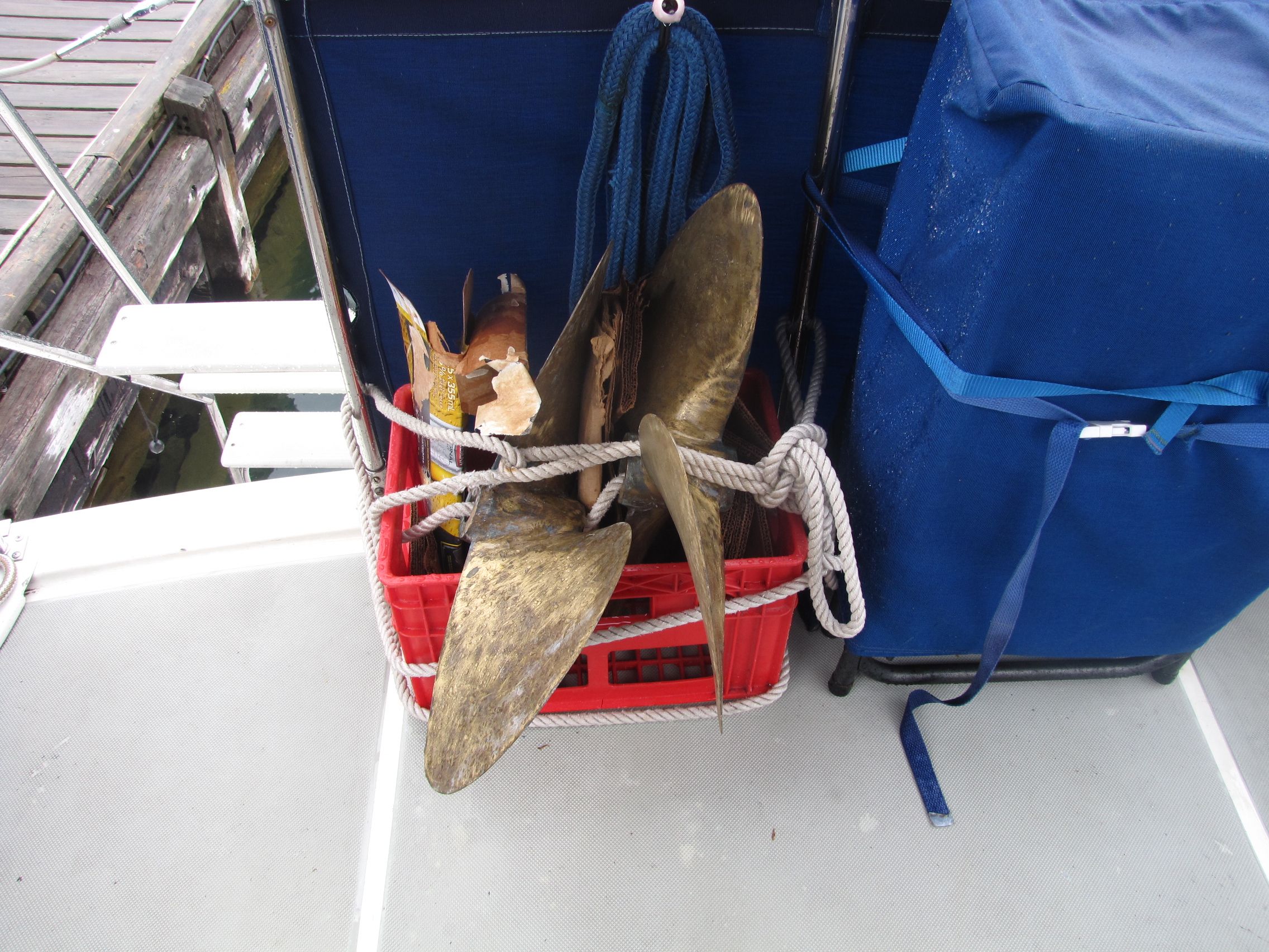 We heard that Erin was on the way at 8 a.m. so she should be here in about 11 hours. We dug out the spare props, which reside under our bed and placed them in a box on the sundeck.
