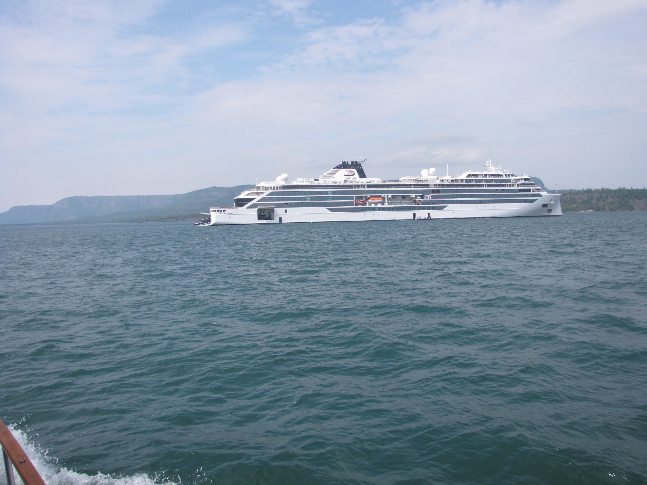 We also began packing up items, that needed to be put away for the winter or taken back to Winnipeg. On Saturday, the wind and waves had subsided, we ventured out, continuing our trip westward. We had first thought we would anchor in the Loon Islands, but continued on and ended up at Tee Harbour, which is part of Sibley peninsula (the sleeping giant), having gone 70 miles. We tied off to a Mooring Ball. We thought we would be protected as south winds were predicted, but once again we were bounced a little by swells. The cruise ship which we had seen earlier in the week, was still in the area- taking people to Silver islet, which was nearby.