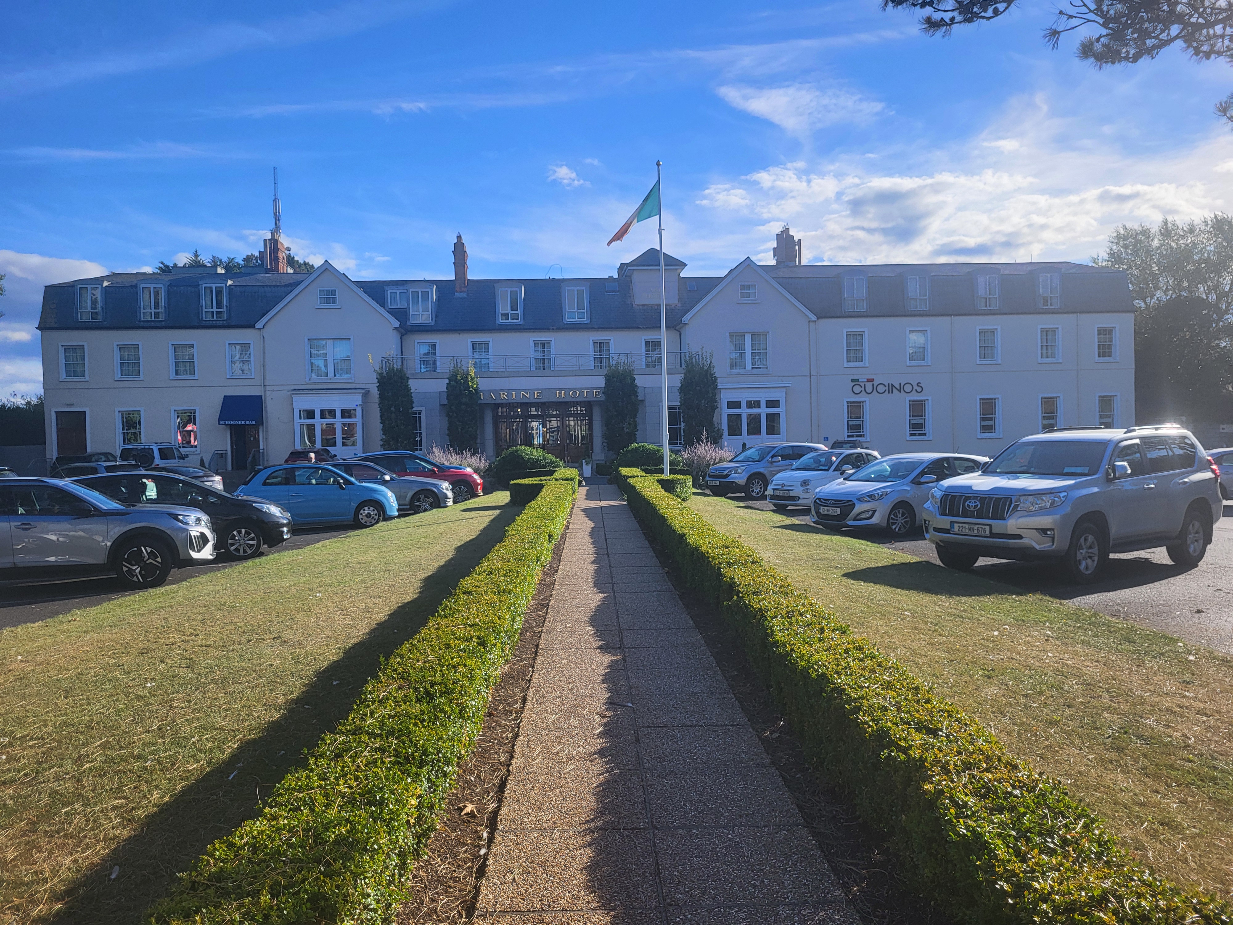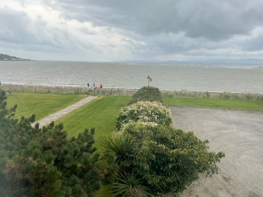 On Saturday, we packed up around 10 and headed for Belfast to return the car and catch our train to Dublin. Since we arrived early at the train station, we were able to take the noon train, instead of the 2 pm one which I had booked.Once again, we took a bus to Newry and then switched to the train. We arrived at Connolly station at 2:15, and got a cab to take us to the Marine hotel in Sutton.We were happy to learn that our room had been upgraded to a sea-side view. This will be our home for the next 5 nights as we explore Dublin. Here’s our view, with a few brave souls taking a dip in the Irish Sea.
