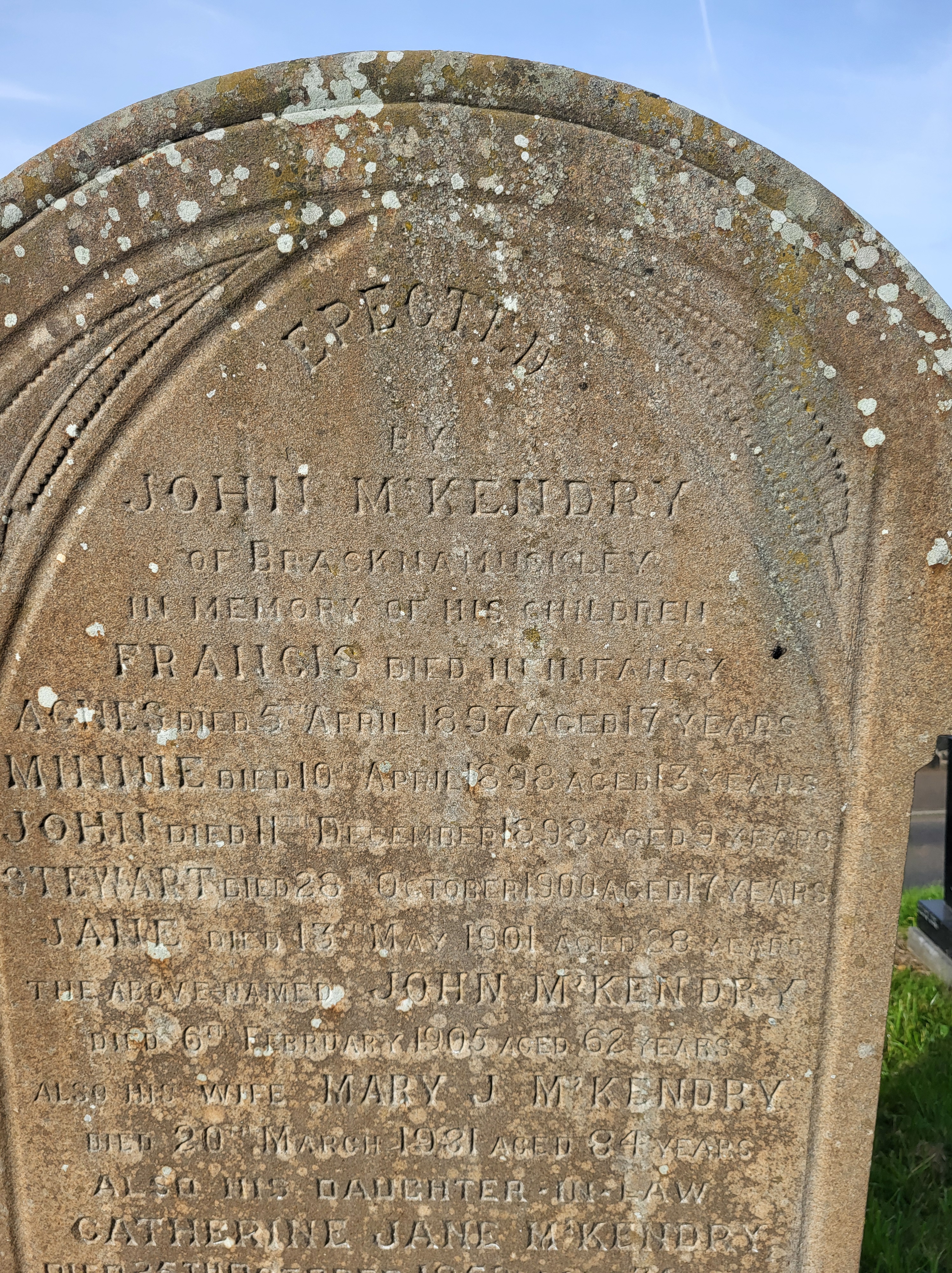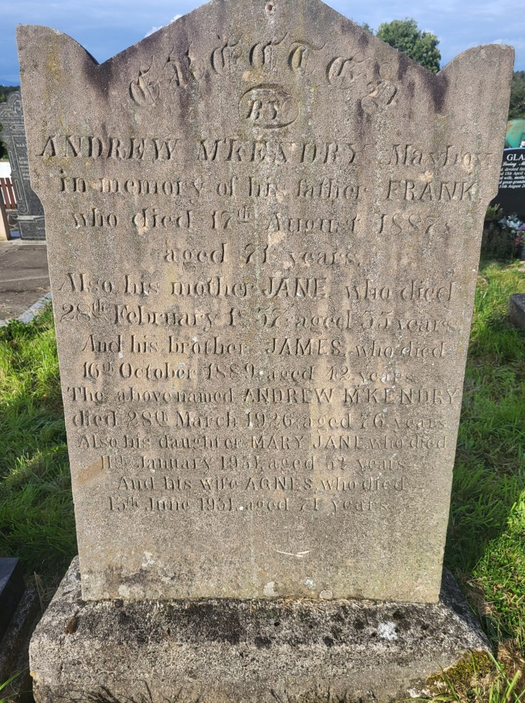 Erected by Andrew McKendry, Mayboy, in memory of his father Frank who died 17th August 1887; aged 71 years. Also his mother Jane, who died 28th February 1857; aged 35 years and his brother James, who died 16th October 1889; aged 42 years. The above named Andrew McKendry died 28th March 1926; aged 76 years. also his daughter Mary Jane, who died 11th January 1931, aged 32 years and his wife Agnes, who died 13th June 1931, aged 71 years.