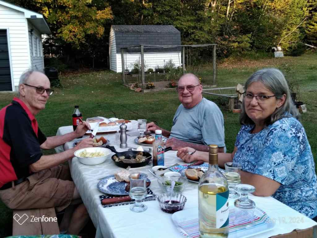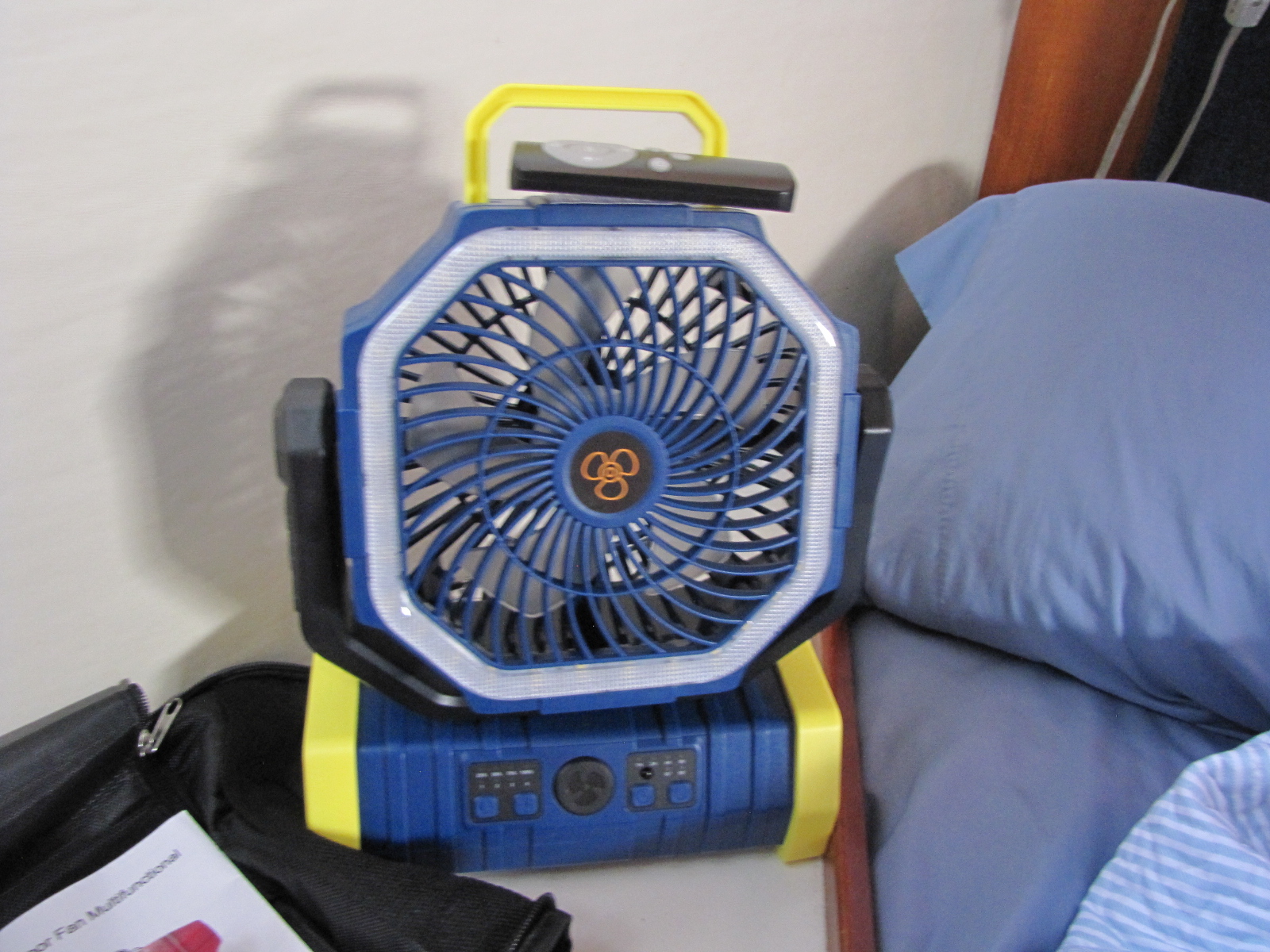 We touched base with the diesel mechanic, he said that the injectors on both engines needed parts, and that they had been ordered, but not yet arrived. So, we are in a holding pattern in Orillia, the engines are in pieces, so we can’t go anywhere, so KI 10 had to finish the tub in our freezer, to fill it up with meat. On Thursday we decided to drive over to Buckhorn and check in with the marina, where we will be putting the boat up this fall, we then travelled to Bancroft and spent the night at Brian and Helen’s, and took them out for their upcoming anniversary KI 11. On Friday Brian drove us back to Orillia, and then took our vehicle to store for the next couple months. Andy checked in with Steve, the diesel mechanic and learned that our parts were in customs—so we will continue to wait. It is a long weekend, so the earliest the parts may be delivered is Tuesday. We will keep busy by doing some jobs on the boat—touching up the teak railings, and cleaning the exterior, some time to explore and more KI 12 & 13 & 14. It was hot before we left to go back to Winnipeg, so I invested in a rechargeable Blue & Gold camping fan—which is getting lots of use. It has multiple speeds, light and timer.