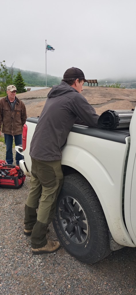 When the staff at the marina arrived, we asked if we could stay a couple more nights, and possibly plug in for power as the forecast was for cloudy and rainy weather. We decided to stay put in Rossport- known as the “Gateway to the Lake Superior National Marine Conservation area”and have Erin pick up Jack here—as we couldn’t make Marathon for Saturday- and didn’t want to move much without a full assessment of the damage. As the day progressed a plan emerged- thanks again to Tim. He was in Red Rock for the music festival and had found a trailer that could likely pull us out to exchange the props. Tim is really an angel in disguise, and has got us out of all of our recent predicaments– hard to believe we only met him July 21st. Will definitely be a lifelong friend—I think Andy already has him on speed dial!