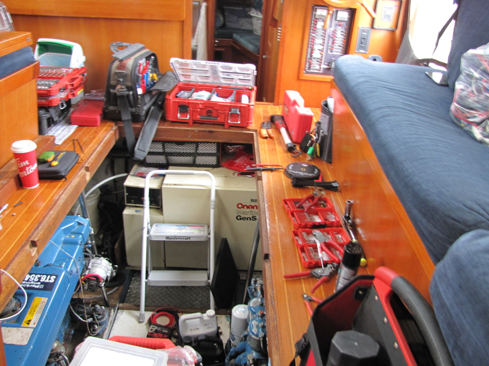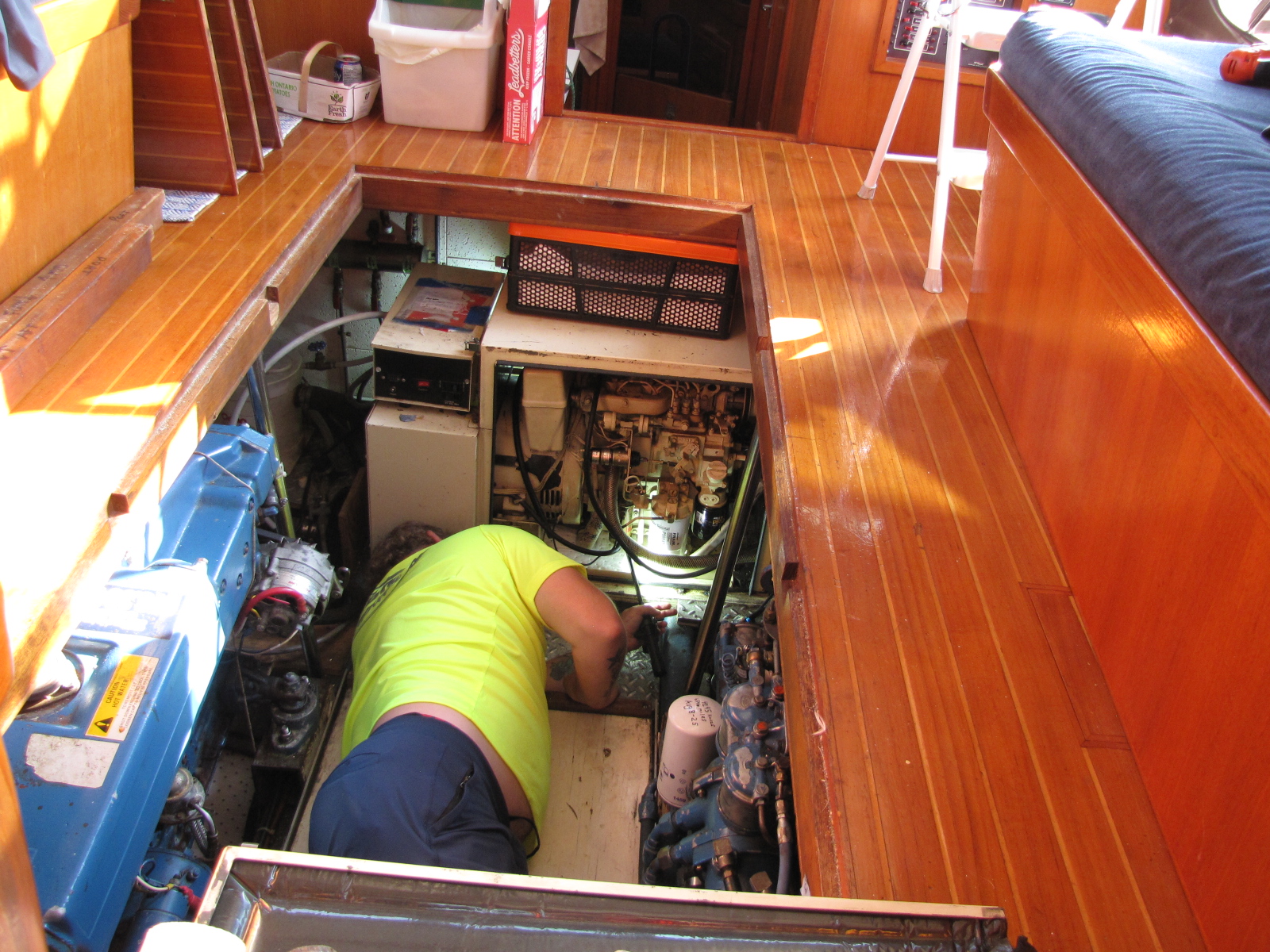 In the afternoon, Tim came and brought us a few presents- step for upper helm, fender cage, impellers, he also changed the two fuel filters, which hadn’t been done in a few years.
