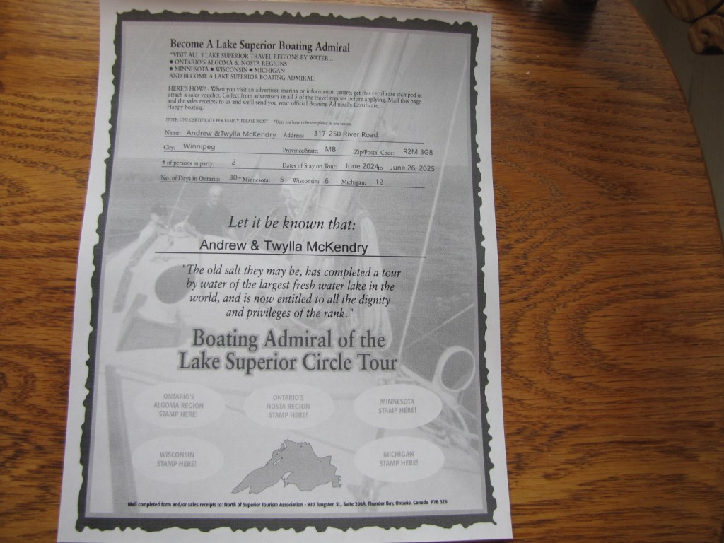 We left Bondar Marina on June 26th, 2024 for our Circle tour of Lake Superior, and arrived back on the same day one year later June 26, 2025. I am happy we did it and got to spent extra time with friends in Thunder Bay and Marathon, but after all the boat issues of the last year my mantra has become: GMOOLS—Get me out of Lake Superior!