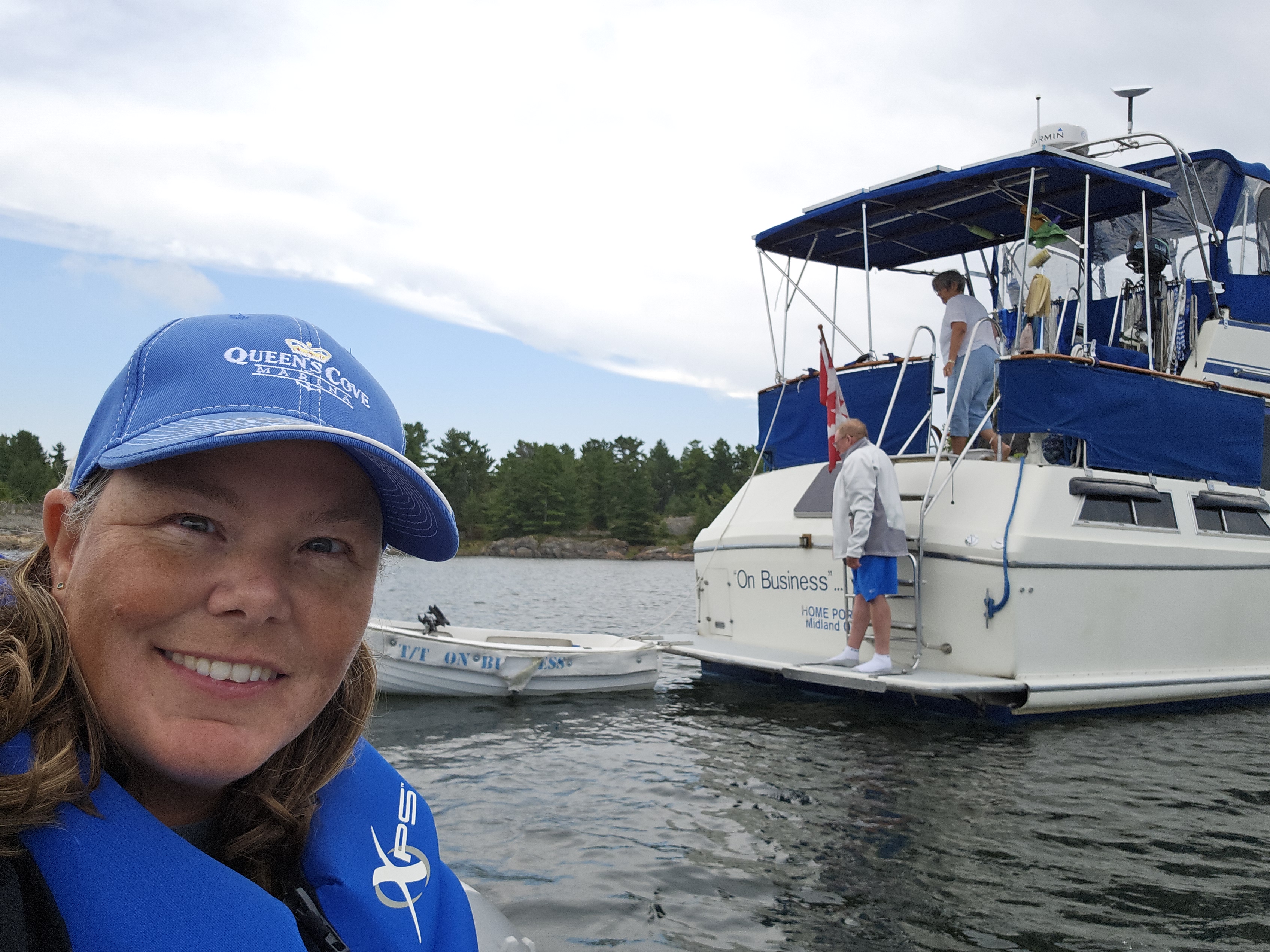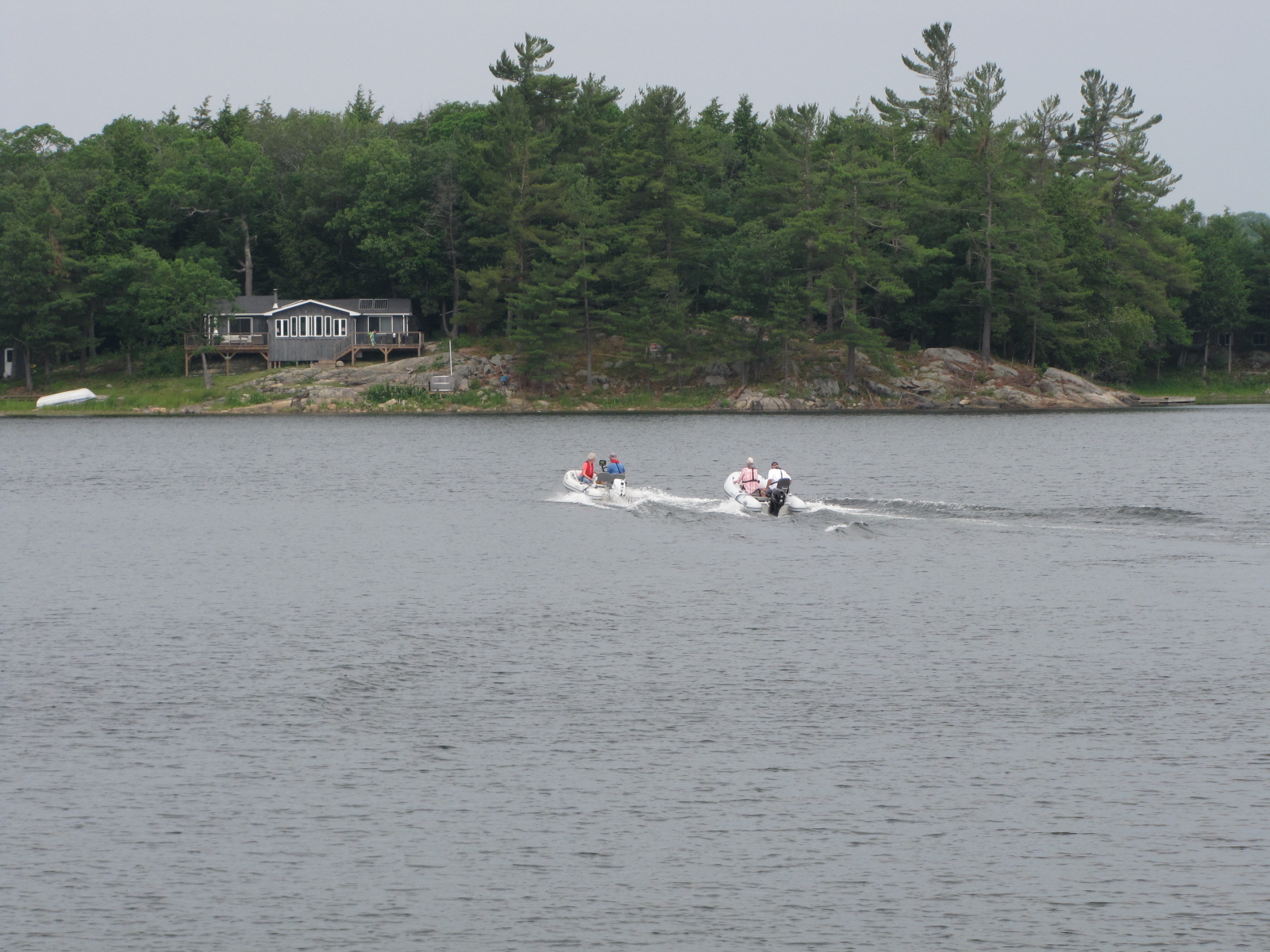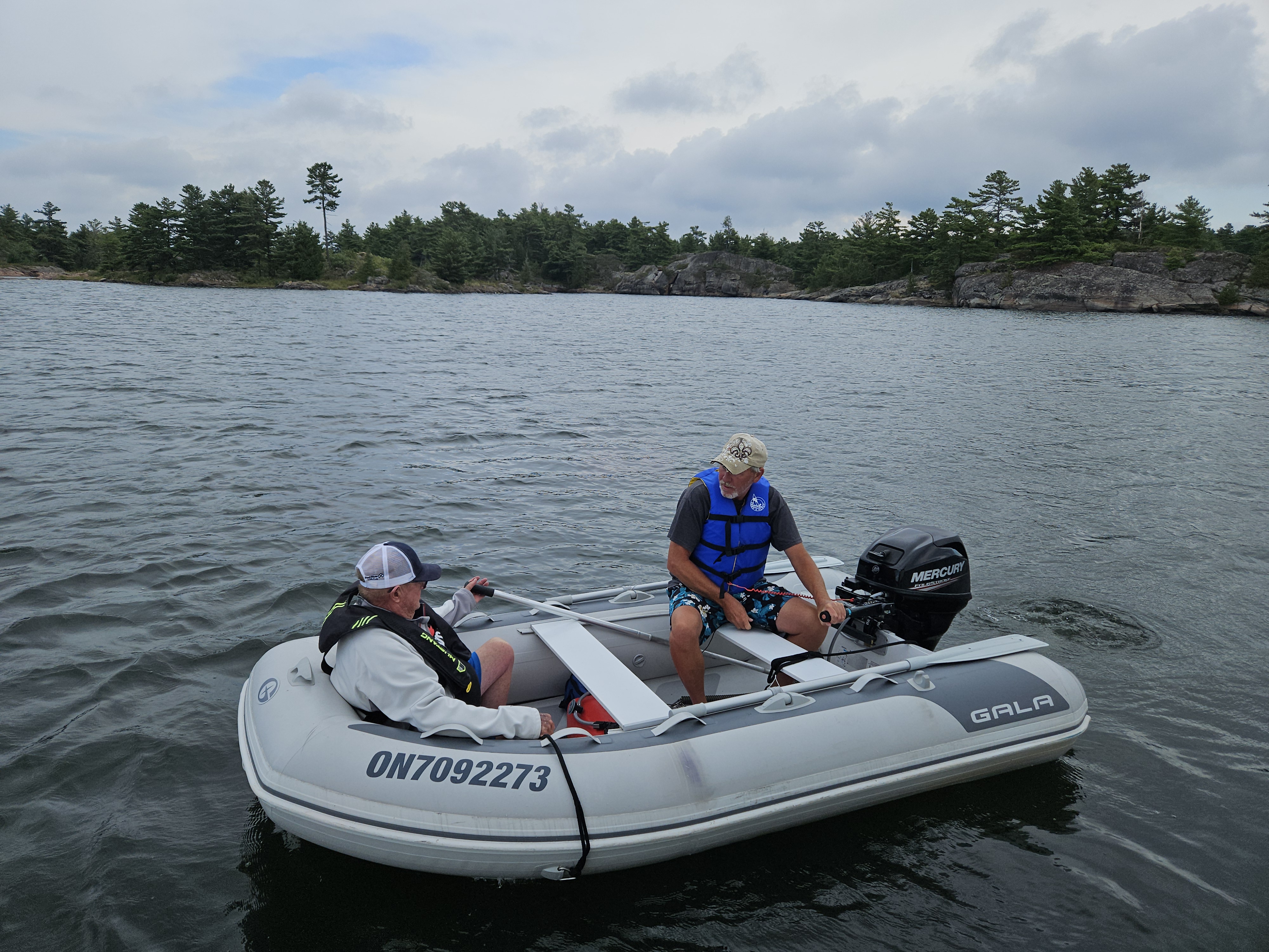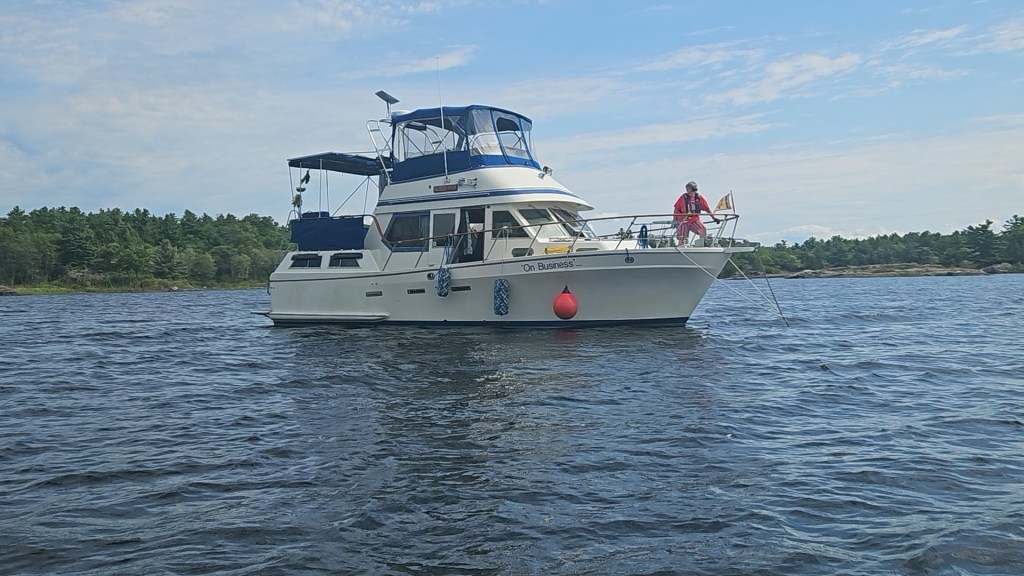 Later that afternoon we helped a boat “Evalyn Jane” in from Clayton NY, with Dale and Jane. We visited with them on their 37 foot Albin. The next morning, we showed them some of our favourite anchorages and were joined by Mike and Candy from “Next Adventure”, who are Aussies traveling around Canada. We met Steven around noon, and he was able to stop the small drip of fuel, and then we were off. We learned from Dale that they were going to Monument Channel, so we met up with the two boats there. It was hot, and we both went in the water for a swim. Jane invited us over to their boat for drinks around 5 Pm, this was the first time we had been in the dinghy this year, and Andy rowed us over. We spent a couple hours visiting, before we returned to “On Business”. We couldn’t get our Anchor light to come on, so put a battery operated light on the boat for the night.