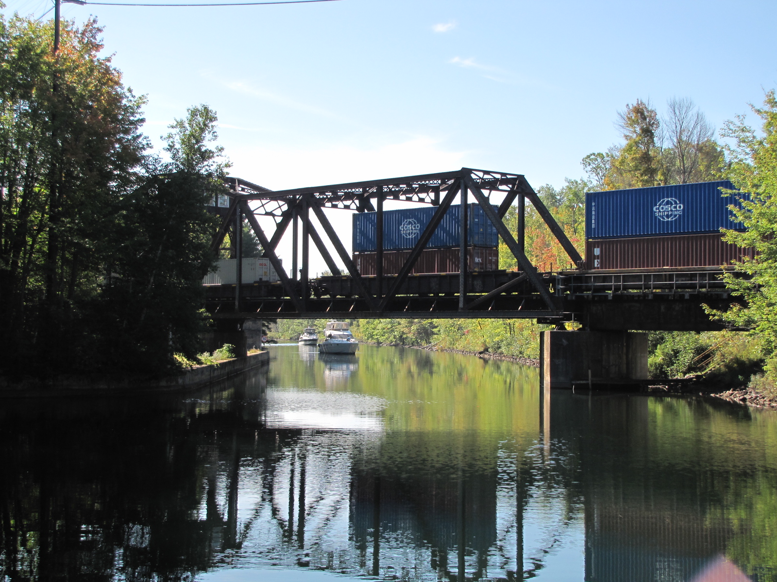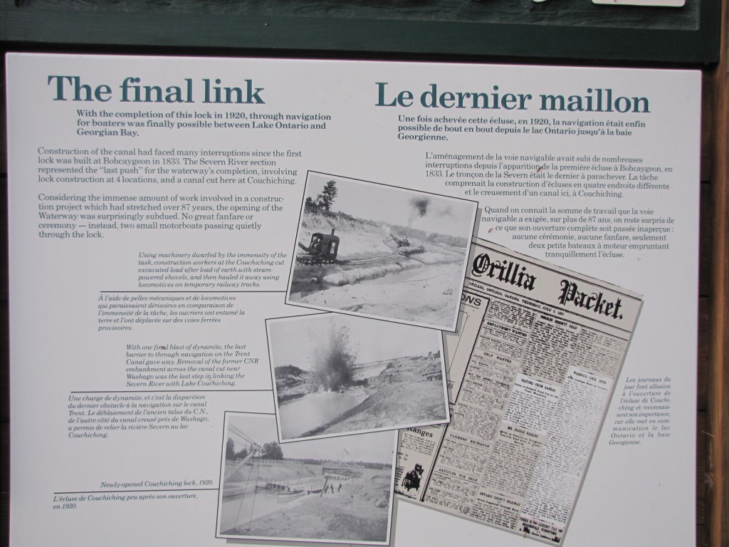 On Saturday we moved on to the Big Chute railway, and tied up on top at the docks. t was really hot with very little breeze, in the afternoon, we went to the Marina for more KIC(3)- not much of a selection, so I had Chocolate. On Sunday morning Andy called the next lock, Swift rapids to see if they had space at the power pedestals- they did so we untied and arrived there before 11 and took a spot with power. It was suppose to be hot, and we wanted to run a fan or the AC, as the night at the big Chute was extremely hot and uncomfortable. We decided to stay for 2 nights, as there is only one more lock before we reach Orillia. We met with some loopers and the captain pulled out his charts and showed them some of our favourite spots. I have recently read the book- a respectable ditch, about the building of the Trent Severn Waterway between 1833 and 1920. Definitely an eye- opener– so much politics involved, and the ideas for it’s use kept changing, in the early days it was used for moving lumber through log chutes, then they thought it could move grain from western Canada down to Lake Ontario- that never happened. It was used for pleasure craft and Steamers, taking people on vacations. I did learn that Swift Rapids was originally a marine railway similar to the Big Chute. Stewart from the lock, showed me some pictures of what it was like prior to the lock opening in 1965, and where the rail lines used to be. Couchiching was the last lock built.