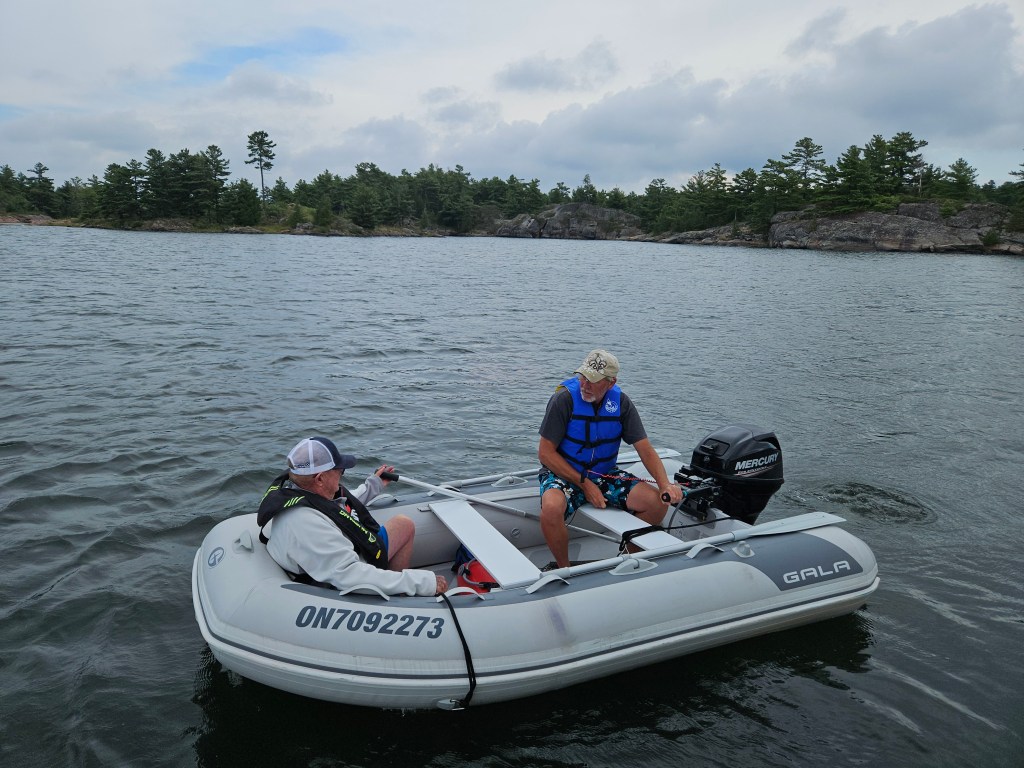 On Thursday morning, we left around 8 am and proceeded through the Hang dogs, through Alexander Passage, and through the Norgate rocks. We arrived in Britt around 11:30 and tied up. We went for a walk to St. Amant to pick up some fruit, however our first stop was Ice Cream on the Rocks KI-15. I tried one of the new flavours for 2025 called “Constellation” – it is described on the website asa rich chocolate flavor swirled with caramel and speckled with cookie pieces, inspired by starry nights. It wasn’t bad, but Coconut is still my favourite. In the late afternoon, Graham Lacey, the former owner of Wright’s marina stopped by for a visit.