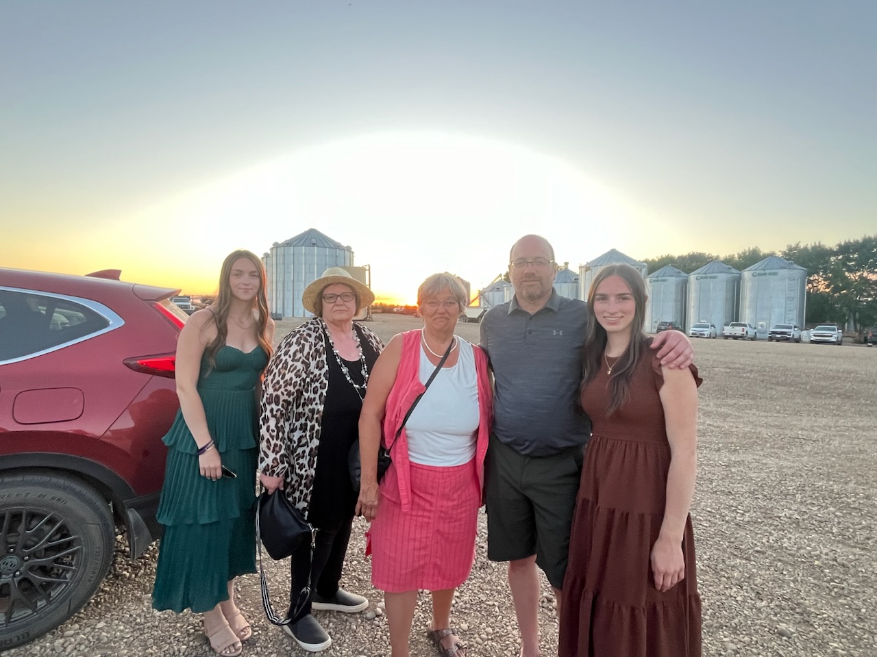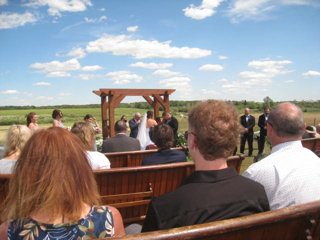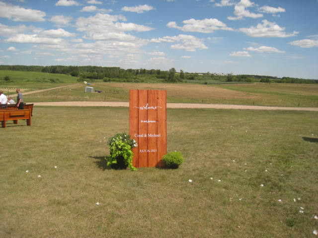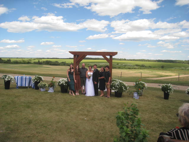 On Friday morning, we left by 9am for the 500 Km trek to Swan River. We went to my sister Maxine’s place and had a visit, for supper we met my sister Heather and went to the Timberland. Town was busy as it was Rodeo weekend. We visited with Heather at her condo and returned to Maxine’s for the night. Saturday morning the 5 of us went to the rodeo pancake breakfast at the veteran’s hall. Andy and I did some shopping in town, and returned to Maxine’s as we had to leave for the wedding by 1:00, as it was at Coral and Michael’s farm just inside the border of Saskatchewan. It was a hot day with blue skies- perfect day for an outside wedding.