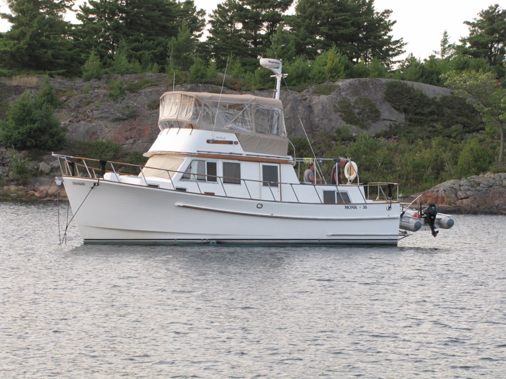 We left on Friday and took the outside small craft channel up to the French River Main outlet; we proceeded up the outlet to the north end and MacDougal Bay. Here, we met Jamie and Sheri who were on Jaime’s 36 Monk called the 3 J’s. We anchored, and it seemed to hold, but then we started dragging and moved to a new spot. The wind was coming up the channel from the south and between the wind and waves we were not very comfortable with this anchorage. Around 4 pm we decided to move to Obstacle island, which had more shelter from the winds, it was a place we had been at in the past.