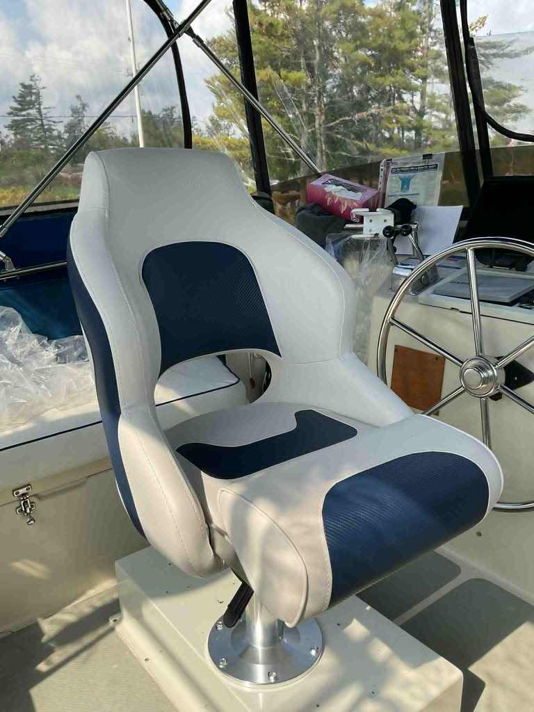 On Sunday we continued along the Trent, going through the Kirkfield lift lock and Rosedale. We stayed at Fenlon Falls for the evening and plugged into power. Around 11pm, we had a thunderstorm followed by rain on and off most of the night. We locked through the Fenlon lock at 10:00 in the rain when they opened and continued on to Bobcaygeon, we were through this lock around noon. Around 12:30 the rain finally stopped, we arrived in Buckhorn at 2:00 and tied up at the lock wall, having travelled 4 hours and about 34 miles. On Tuesday Brian Hayton, met us at the lock with our car, he is joining us for a week on the boat. He had brought along a couple of boxes that Andy had ordered on Amazon—a new captain’s chair and pedestal. In no time, they had it installed.