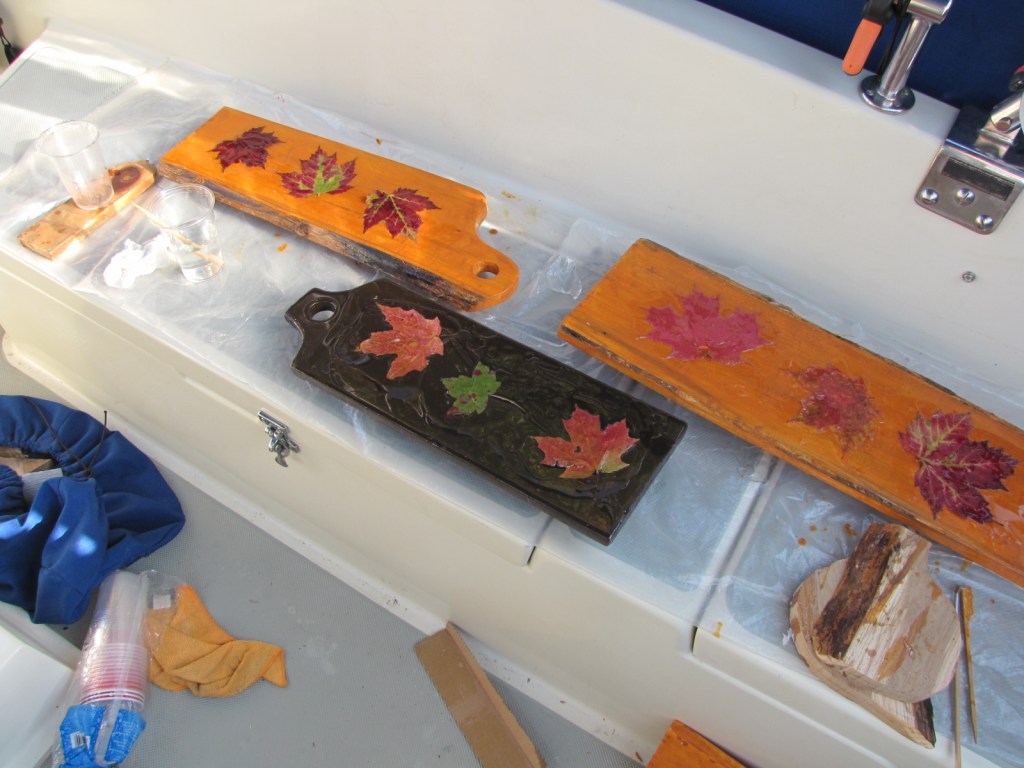 Just before 10, we left Lovesick and headed to Burleigh Falls lock, we had a 28 foot drop and were out by 10:30. We proceeded across Stoney and Clear Lakes to Young’s Point and tied up on top before noon. In the afternoon we went shopping to the General store and bought a few things including Kawartha and to the Lockside trading post. It was overcast most of the day, and we had another rain shower around 4:00. We treated ourselves to KI-17, KI-18 and KI-19 over the next few days to empty to Kawartha container. On Friday we went about 8 miles and tied up at Lakefield, where we were able to plug into power. We walked into Lakefield in the afternoon and did some shopping. On Saturday, Andy and Brian, put an exhaust fan in, which entailed cutting through the fiberglass in order to vent it out from the kitchen. By using a jigsaw and Dremel tool they were able to cut a large enough hole for the fan. They also removed the Kenwood 5 CD changer that no longer worked, and replaced that opening with screen, as a vent for removal of the hot air. Brian also installed a switch for turning the fan on and off. In the afternoon the guys walked back into town to get a few more groceries & beer. We’ve been playing more cards while Brian has been with us, as well as the guys play cribbage. The weather today was partially cloud but warms and I was able to wear shorts again. The leaves are changing colours on the trees and falling- very beautiful, they are clogging up the locks and appearing in some of the old guy’s crafts.