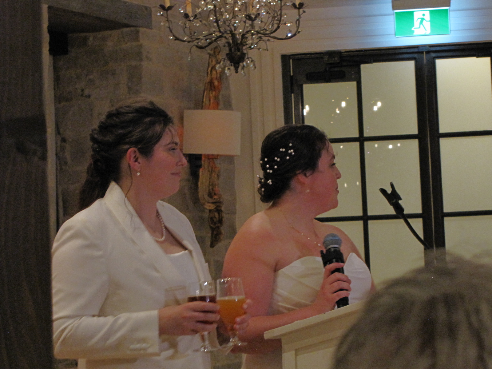 Following the ceremony, people moved to Michael’s parent’s property for some visiting followed by the reception and dance, which was being held in the machine shed for 324 people. On several occasions during the reception- local home brewed tea was offered in shot glasses to those who wanted to try it, I sampled something called Lemonade, and Apple Pie. We sat with my nephew Chris and his wife Jen, along with Gord’s sister Wilma and her husband KD, and my nephew Craig’s (father of the bride) neighbors Mary and Blair Martin– who are related to our apt property manager- Small world!