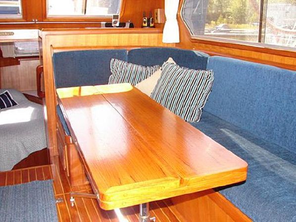 Large (9ft X 8ft) center cabin with custom teak collapsible table makes into a double