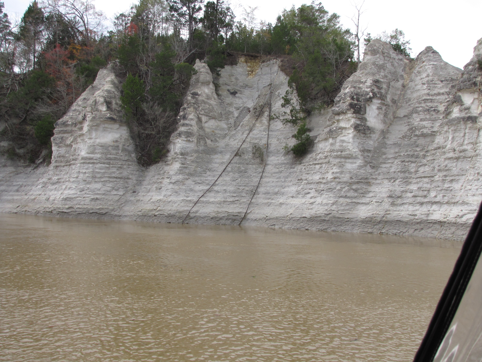 Had a great sleep, the boat hardly moved at all. There was no rush to leave early today as we’re only going 50 miles to Demopolis, and only have one lock- the Howell- Heflin which is about 4 miles away from our anchorage. Andy put the generator on and warmed up the boat, while we waited for the mist to clear up. Started the engines at 7:45, made it through the Lock by 8:30, perfect timing as a northbound tow was just coming out of it when we arrived. It started out as a sunny day but soon became overcast. Once again there was lots of debris, however as we went along it changed from the green foliage to lots of logs and broken branches. Only saw a few fishing boats on the river but the people were wearing camouflage and orange toques, so we may have mistaken fishermen for hunters. Saw these cliffs, which looked quite interesting.