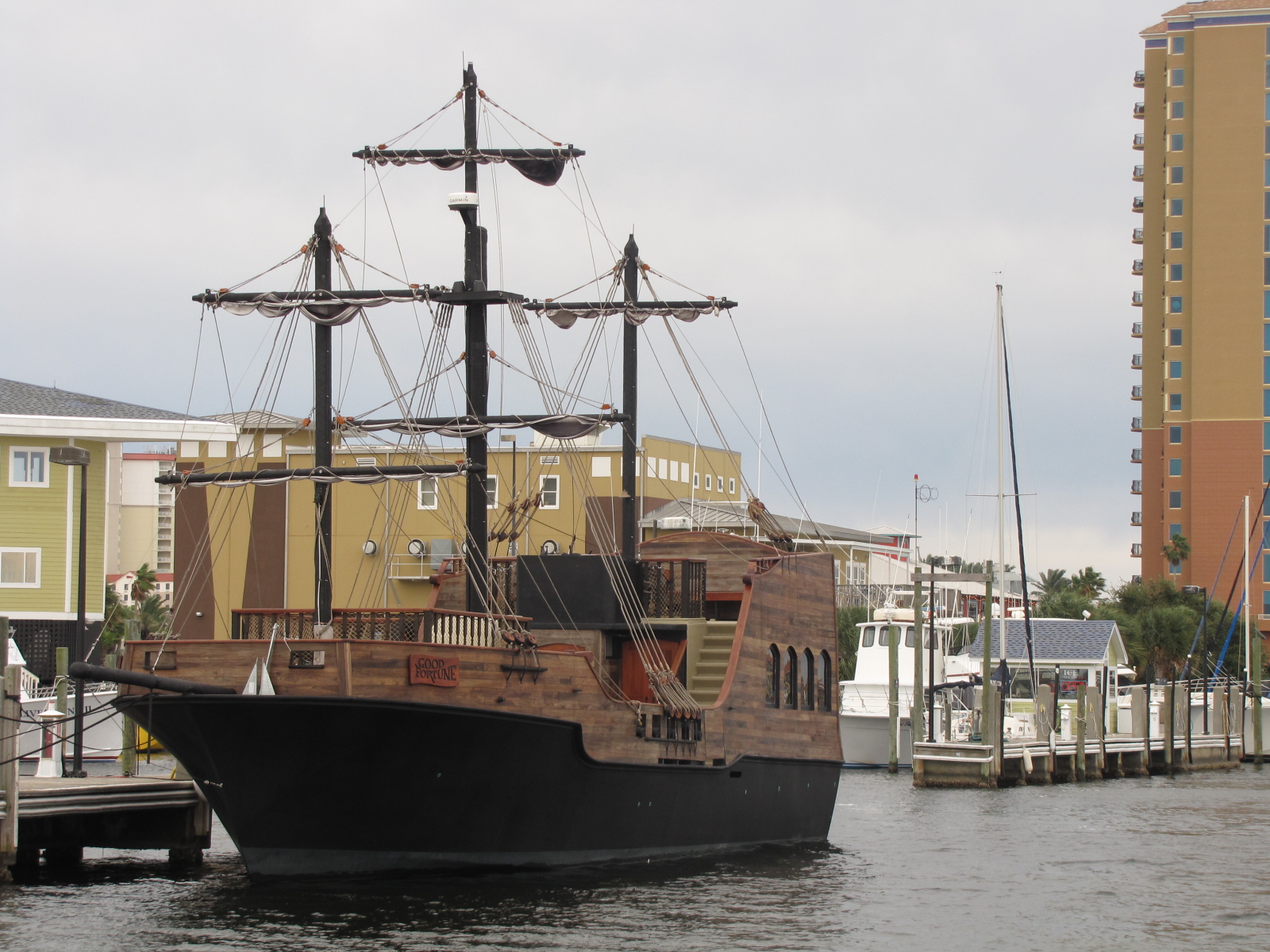 We saw several tug and fishing  boats coming in off the Gulf headed for Pensacola, but no other pleasure craft.  Crossing the Bay and getting  behind the protection of the Santa Rosa island seemed to take forever.  Finally at about 12:30 we reached Sabine Marina in Pensacola Beach, which we had called in the morning looking for a transient slip, because of the small craft warning.   Near the marine I saw this Pirate ship, which I’ve included for Jack.