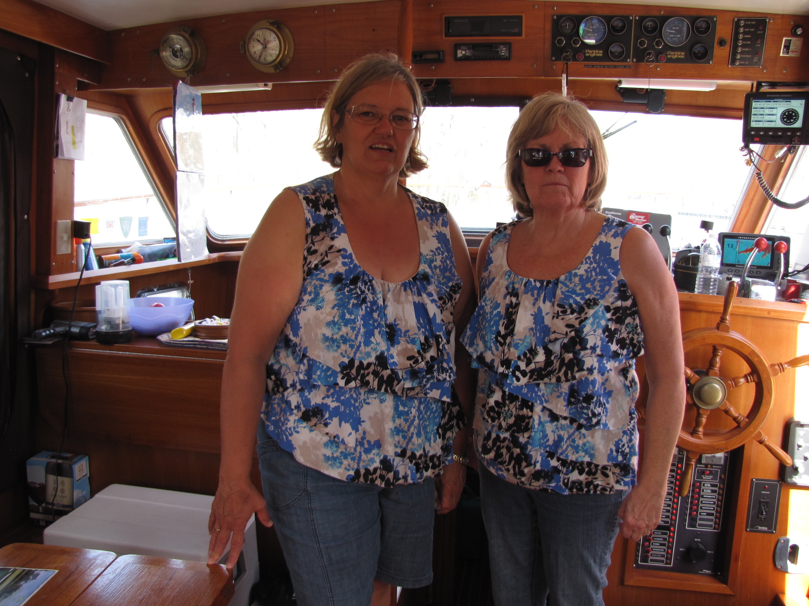 The mechanic came on Tuesday and helped Andy change the Olive seals as well as the fuel and water separator filters. On Wednesday, Andy went golfing and I took down the fly bridge canvas so that I could wash the windows. After golf, the Bancroft crew of Brian V, Brian H and Bob stopped by when they dropped Andy off. Wednesday we both did a little more cleaning on the outside of the boat- removing more of the salt film that we had accumulated. On Thursday Brian V, Helen, Bob and Kymm came to the boat for a 10:30 departure to Wacca Wache Marina for lunch at K-Rae’s restaurant. Kymm and I shop at the same stores as we were dressed alike.