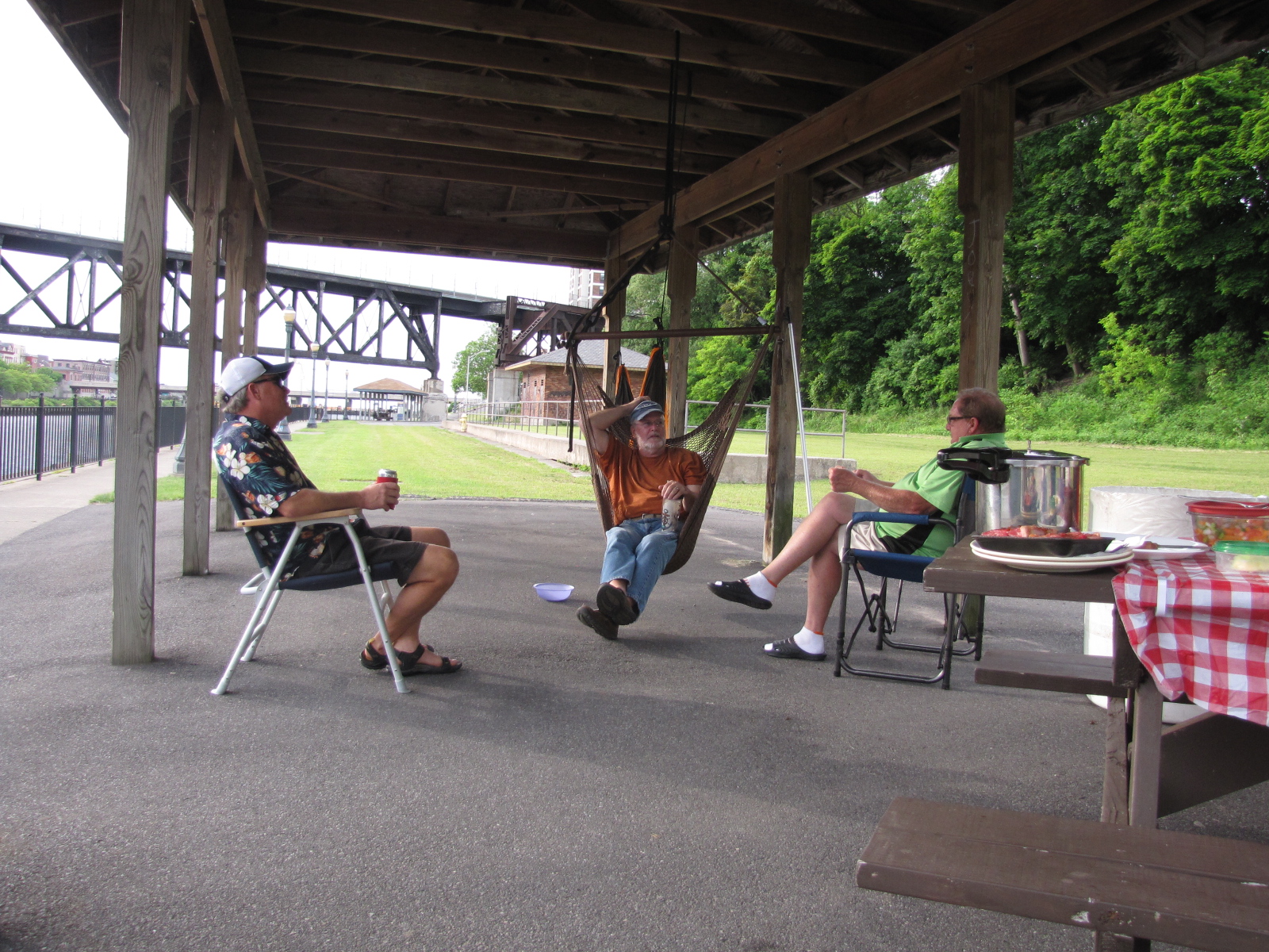 On Tuesday, Brian Vermeersch came in the late afternoon, after golfing in the area and instructed Andy on how to repair a cracked hand rail. Roger came around 5:30 and replaced the coolant hose. Brian then took us to Gananoque to do some reprovisioning and he spent the night.