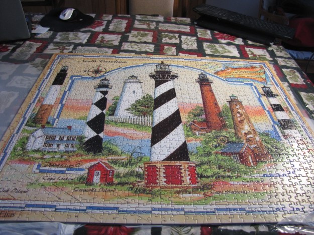 We had a family gathering of the McMorlands (Andy’s Mom’s side) prior to Christmas and had about 40 people come to our place for a visit. Andy’s 99 year old aunt was among the party goers, and we were very glad she had come as the following month she passed away. During the Christmas break, I did my usual puzzle, but I broke with tradition and actually did 2 1000 piece puzzles instead of one. The first was the lighthouse, which I had bought along the trip and the second depicted Canada’s game- hockey.