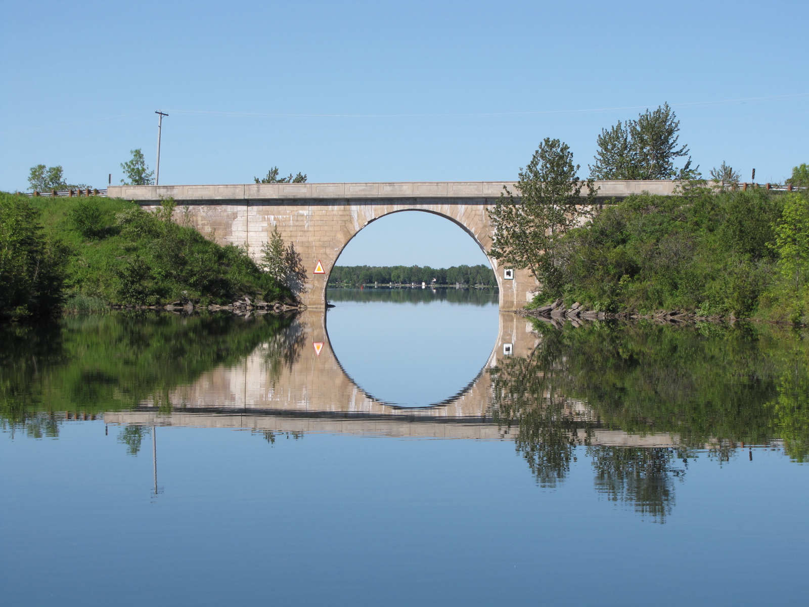 We awoke Wednesday morning to clear blue skies.  We left at 9:20,  after Canal lake,  we passed  through the Hole in the wall bridge, with the reflection in the water, I got this picture.We arrived at the  first swing bridge for it’s 10:00 opening. Our timing was almost perfect as we went through another bridge followed by 5 locks  to reach Lake Simcoe by 12:35.  We only had to wait a couple of minutes at one lock for a boat coming out, otherwise we were alone as we moved westward.  Lake Simcoe had hardly a ripple on it,and we crossed the 20 miles and were docked at the Port of Orillia shortly after 2:00.  The marina office and shower renovation is almost complete and the facilities are amazing, last summer when we were here the showers were in a temporarily set up in a trailer.