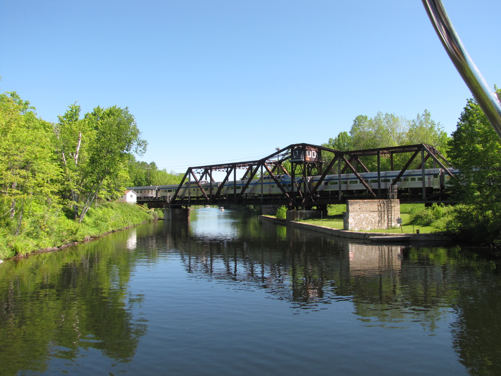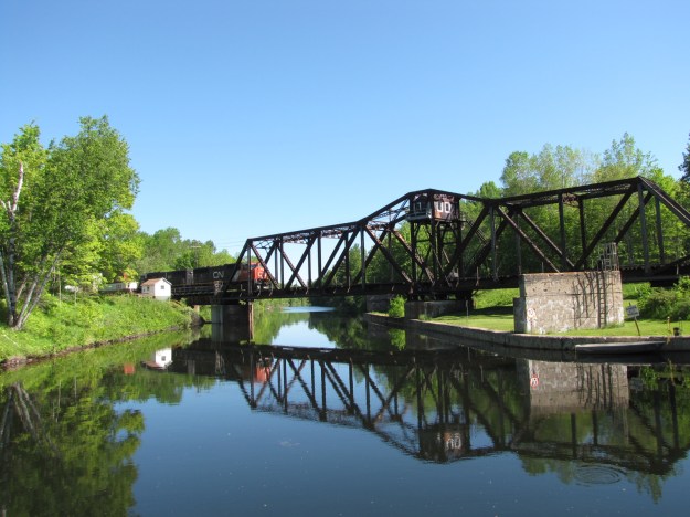 Thursday morning we left the marina at 8:20, crossing  Lake Couchiching  in order to make the CN swing bridge for 10:00 as they work the same hours as the Parks Canada locks.  We arrived at the bridge at 9:45,  but needed to wait until after 11:15 before the bridge opened.  Apparently this is the CN main line, and the bridge doesn’t open if there is an approaching train within 30 minutes.  So we waited with several other boats and saw  2 freight trains and a passenger train pass by.