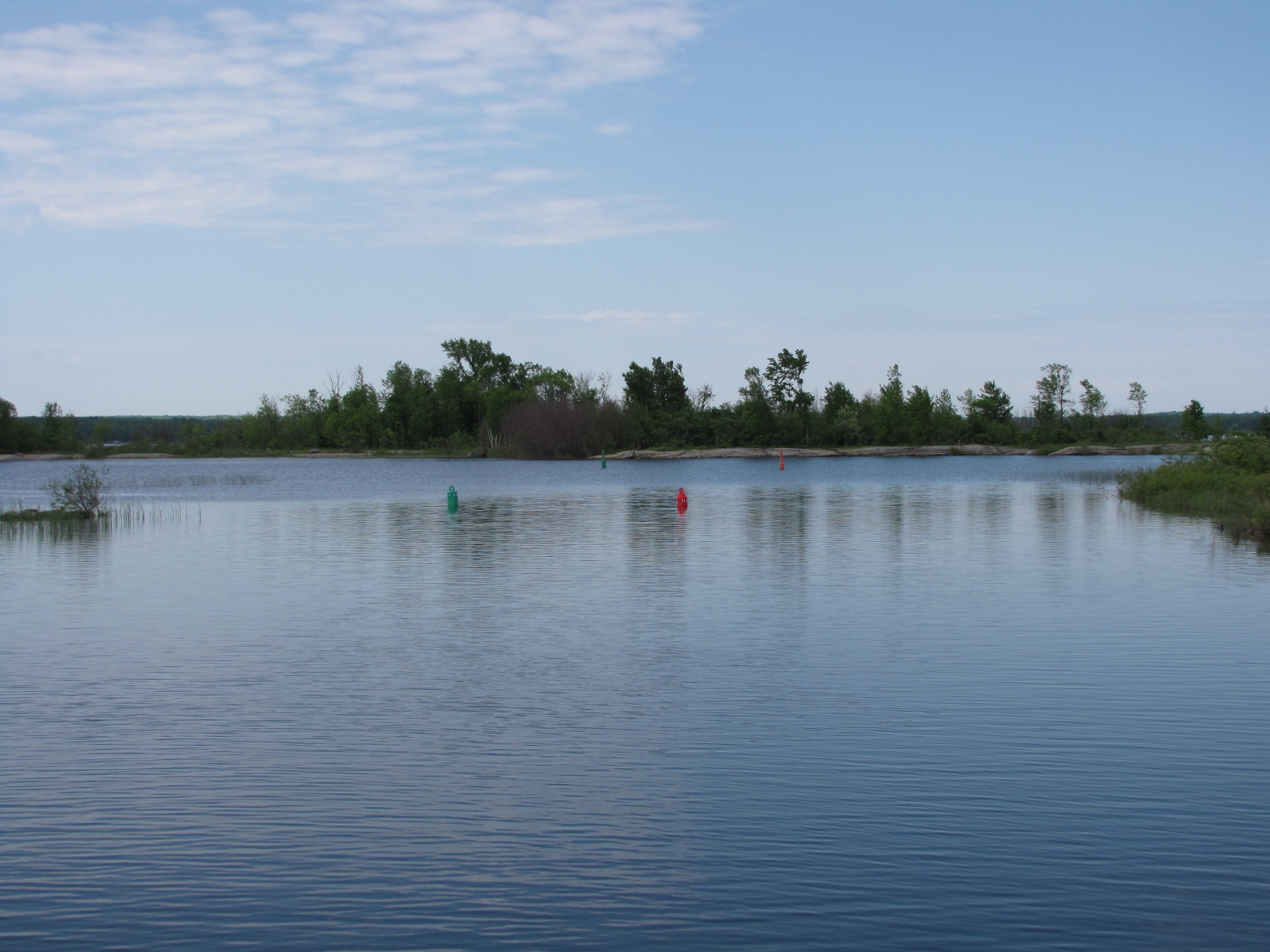 and tied up at the docks.  As we were going down the chute, I noticed a workman between the rails of the carriage making measurements.  We went up to the restaurant for ice cream, but they were  already closed. We went back to the Chute and watched as a Parks Canada crew replaced one of the cables that move the boat carriage.   It was a quiet evening, and we were all alone again.  We left the dock by 8:00 to proceed to Port Severn and our last lock before reaching Georgian Bay.  Weekend hours for the locks are 9-6, but when we arrived, there were already boats in line for the first lock down, we tied up on the blue line and waited.  We were out into the bay by 9:50.  Once again there was very little wind, so the Bay was quite smooth. Our destination for the day was Beausoleil Island, which was about 12 miles away, we check-in at noon.  We had stayed here in the past,  our Parks Canada Mooring pass is accepted here, as it is a national park.  In the afternoon, Andy spent time on the deck enjoying the sun, while I finished sewing the Velcro onto the curtains that I had made. We had a great visit with an older couple who had been boating for many decades, here in Canada and the Bahamas.  A great day on the Bay!!   One week of vacation gone- 4 more to go!!