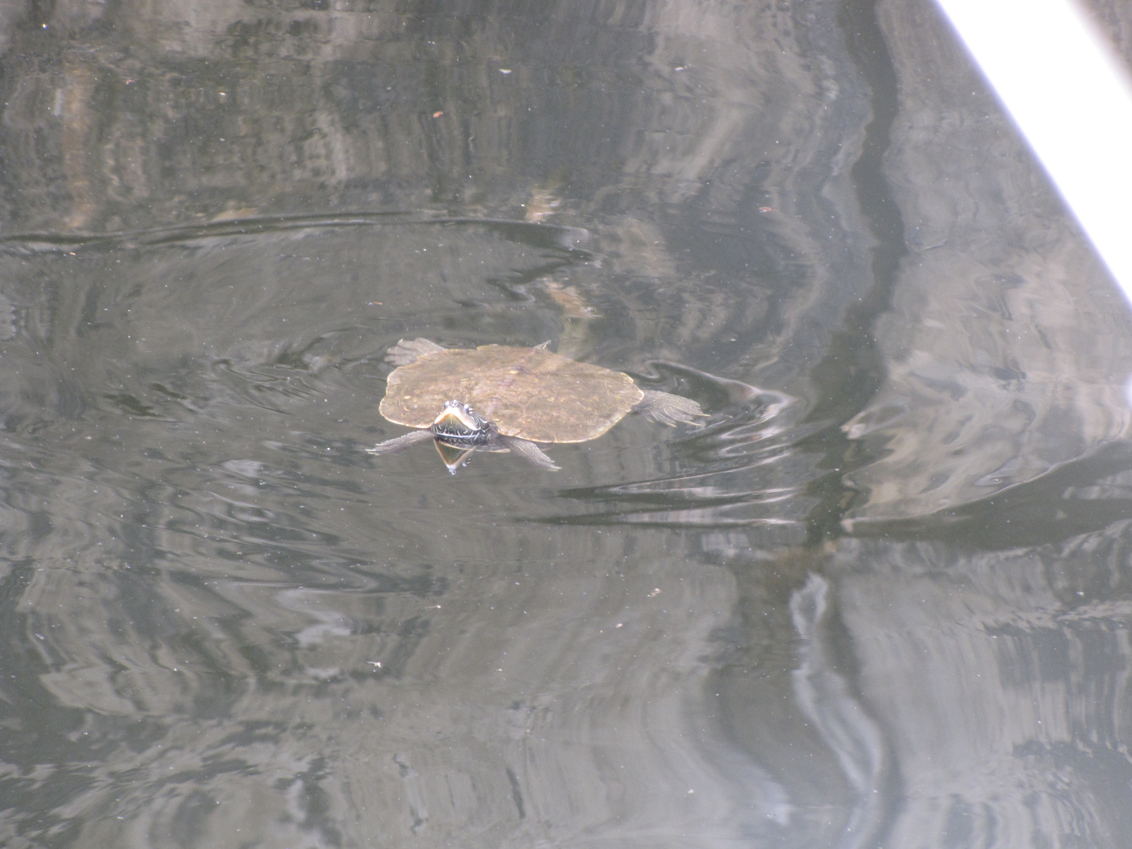 I’ve been experiencing issues with my Canon camera ever since we left Winnipeg, every time I turned it on it was asking for the date and time, and I couldn’t take a picture until I had entered it. I set it at least 30 times, but it wouldn’t keep it in memory. Last night I was fed up and searched on the internet for a solution. I found out that I needed a Lithium battery for the date & time. So this morning when Andy went to Canadian tire I had added the battery to his list. The camera’s date time function is now working. We left Campbellford at 9:50 and followed Navigator IV to our first lock for the day, it was the Ranney Falls flight (locks #12 and #11) – meaning 2 locks in succession, with a total drop of 48 feet. We were through by 10:35. In the second lock we had company; I saw two turtles and was able to snap a picture of one of them.