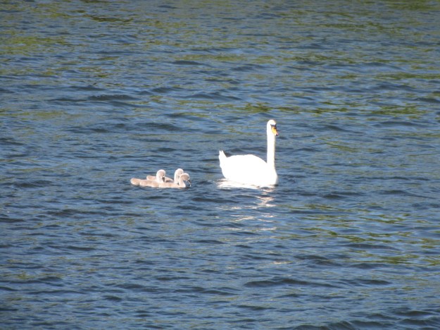 We anchored by 2:30. Andy did some fishing, and I relaxed and read a book. Took a few pictures of a family of Swans that were living near the Island.