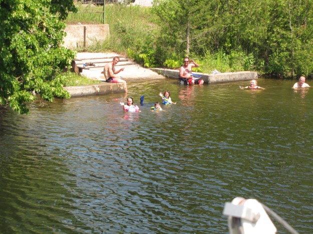 We were out of lock 1 by 9:20, lock 4 by 10:35, Lock 10 by 3:10 and lock 12 by 4:15. We were tied up at Campbellford municipal dock by 4:25. Making a new record for us on the Trent by passing through 12 locks. It was a really hot day, and lots of people were playing in the water.