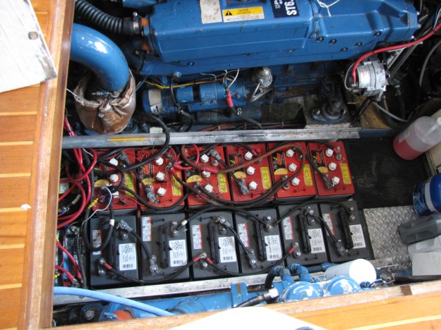After having Kawartha ice cream,we drove up to Bancroft and spent the night with Brian and Helen. On Saturday we did some grocery shopping for the trip and drove back to Buckhorn filled the fridge and I unloaded the car. We drove back to Bancroft for the night. On Sunday morning we met Brian and Muriel for breakfast before returning to Buckhorn again. There was still a lot to be done and Gene, said he would return Monday morning. Monday was a dreary day- We took the boat out for a short trip which involved driving around in circles to calibrate some of the instruments. While doing some testing in the morning Gene determined that some of our batteries were defective, so we decided to change out 6 of the 12 batteries for new ones. While looking through some old boat bills, I ascertained that the batteries were likely 9 years old, and had surpassed their life expectancy. The batteries arrives at 2pm from Peterborough and were in the boat and hooked up by 4.