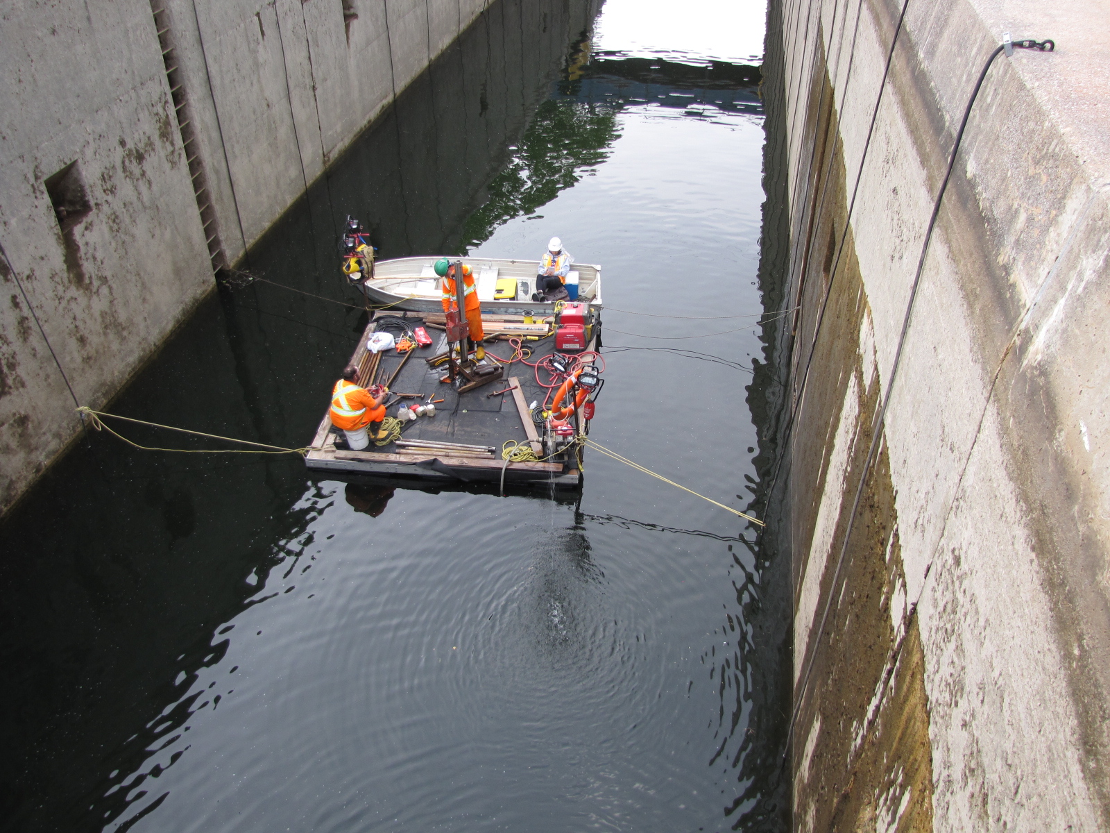 before the bridge tender could swing the bridge open for us. We reached Couchiching by 3:00 and tied up. This was the nicest weather day of our trip so far. Andy was having a few electronics issues so was in constant contact with Gene, to figure out the solution. That evening we watched some workmen taking core samples from inside the couchiching lock.