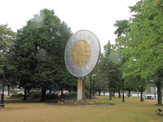 Where did July go? It’s hard to believe that it is now August 1st. Andy made scones this morning, and I enjoyed them with peanut butter and the strawberry jam, that Helen had given me a few weeks ago. Around 11:00, Brian and Helen arrived from Bancroft for a visit; they had brought some small tomatoes and corn. We walked over to the patio of the 52 North pub and grill, the patio overlooks the Trent Severn waterway. I enjoyed a reuben sandwich and salad. We visited a little at one of the picnic tables in the park. Since it was a hot day the park was bustling with lots of groups playing games- something resembling cricket, flying drones, getting their pictures taken with the huge Toonie or in front of our boat and having picnics. It seemed that as one group vacated a picnic table or area, another group arrived. It was busy in the park until 9:00. Once again I had trouble sleeping in the bed, and spent the night in the salon, with my head and knees propped up with pillows. I finally moved into the bedroom at about 4:30 and slept there until about 7:30. I woke up to rain, and it has continued for most of the day. There have been very few people in the park today, I saw one group come and start setting up their picnic, but it began pouring, so they packed up and left.