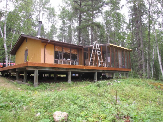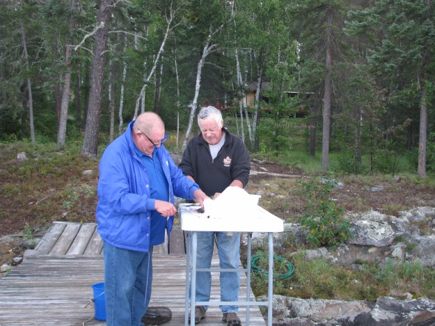 They don’t have power or running water, but rely on battery power. Mike was there, and he agreed to take Andy out on the lake fishing. I didn’t have a fishing license so declined. They were out for a few hours and came back with a bunch of Bass. Mike is a fishing wizard, and knows everything about the lake and what attracts the fish to the hook. We had a feast that night– much tastier fish than any of the halibut we had been eating at restaurants over the summer. In the evening we played cards. On Saturday, Mike returned to Winnipeg, and Andy helped Dave with a couple of projects around the camp, and later in the afternoon, the two of them went fishing. Elaine and I stayed back and worked on a puzzle that had been started earlier in the summer. When we completed it we realized that one of the pieces was missing. Elaine thought that maybe Caitlin’s cat had hidden it. Andy and Dave returned with a few more Bass. We had bbq’d steak for supper and again played cards.