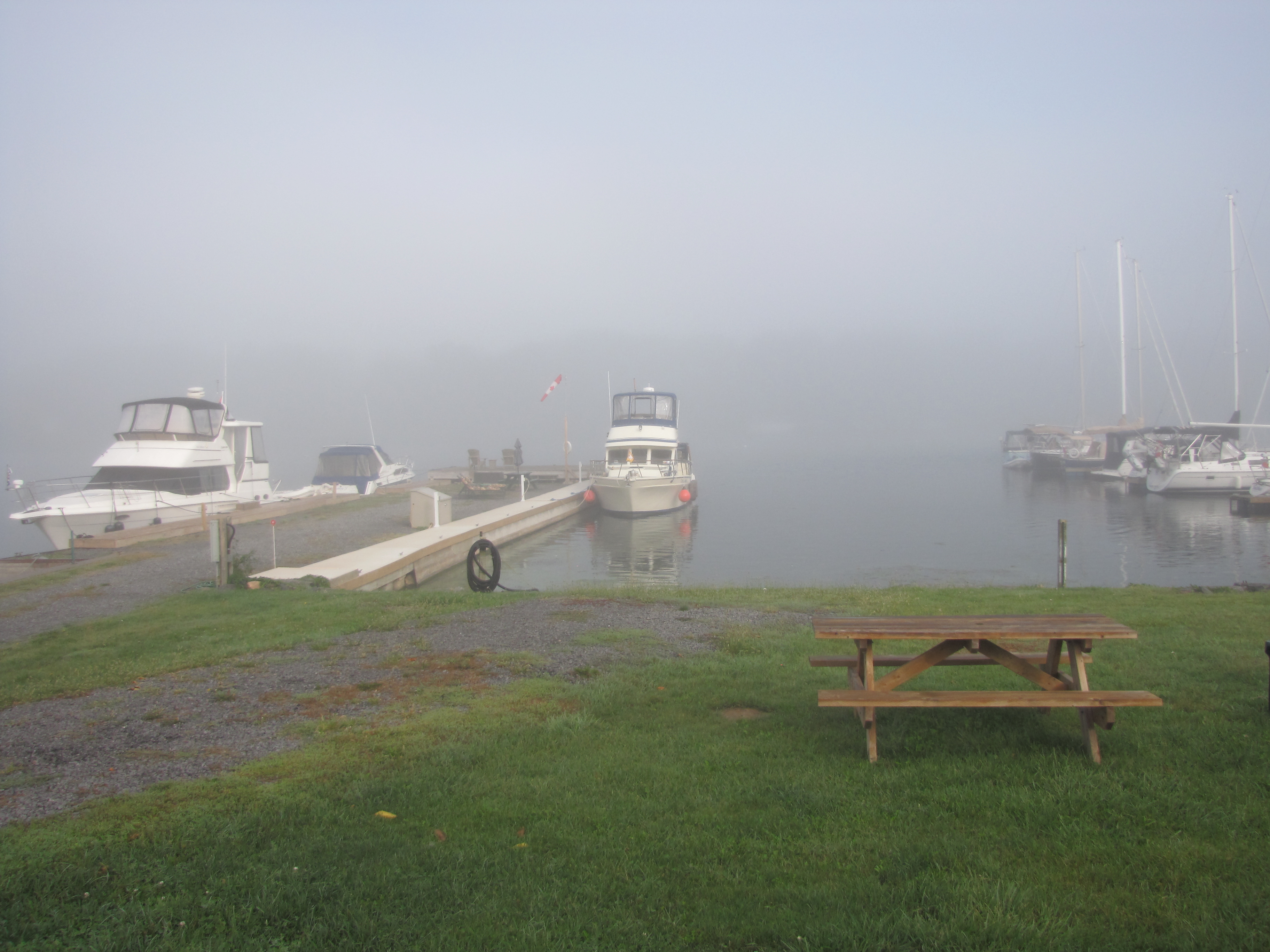 In late afternoon, my sister Maxine called to let me know that Mom had been admitted to hospital and likely wouldn’t be coming out. We decided that we would try to get back to Buckhorn as quickly as we could- but it was 13 locks away. Luckily it was the weekend, and lock hours are 9 to 4:30. When we got up Saturday morning, we were quite fogged in at Lock 17, within 30 minutes, it was starting to lift, so we fired up and left shortly after 7:00.