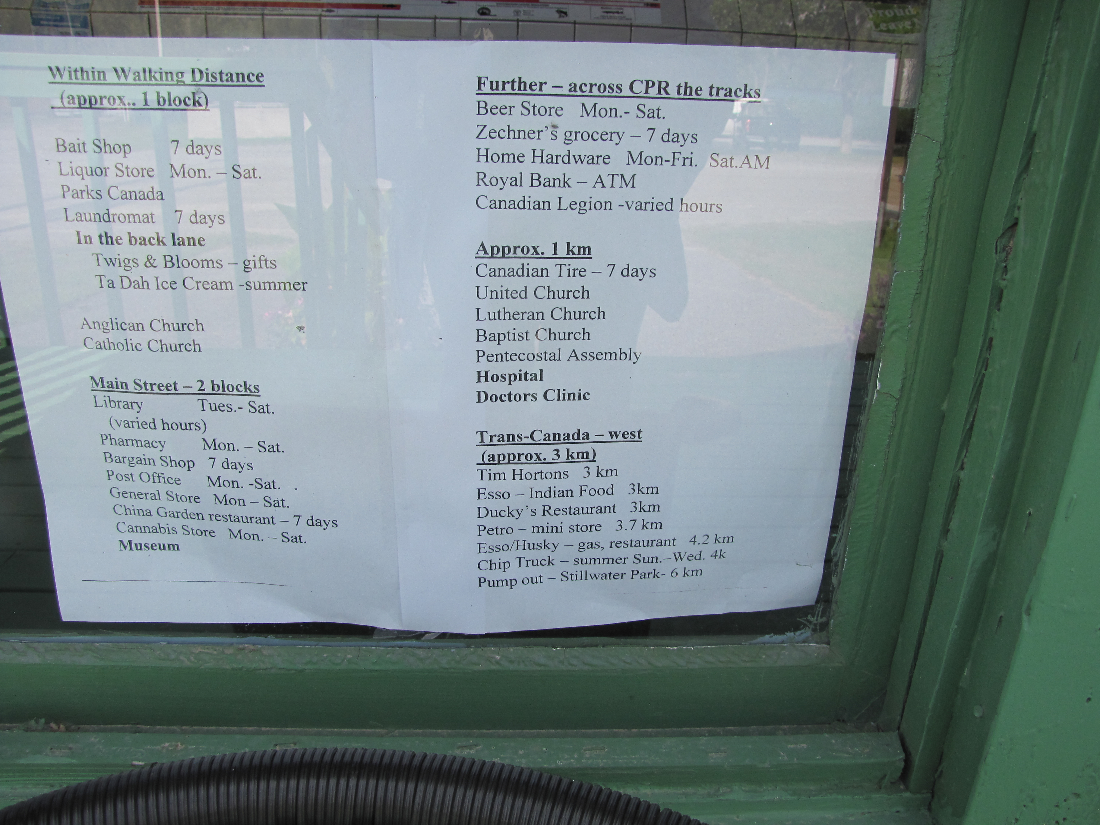 I spoke with a Parks Canada employee, and he directed me to the marina office, which was closed, but I did get some pictures of information which will be useful.