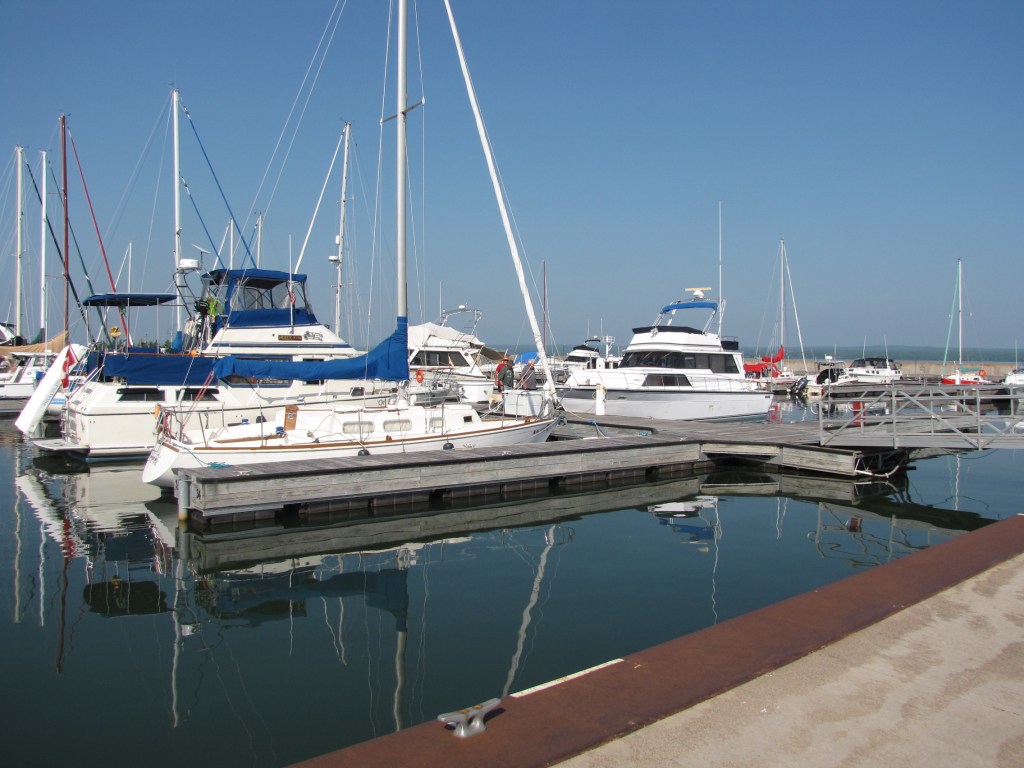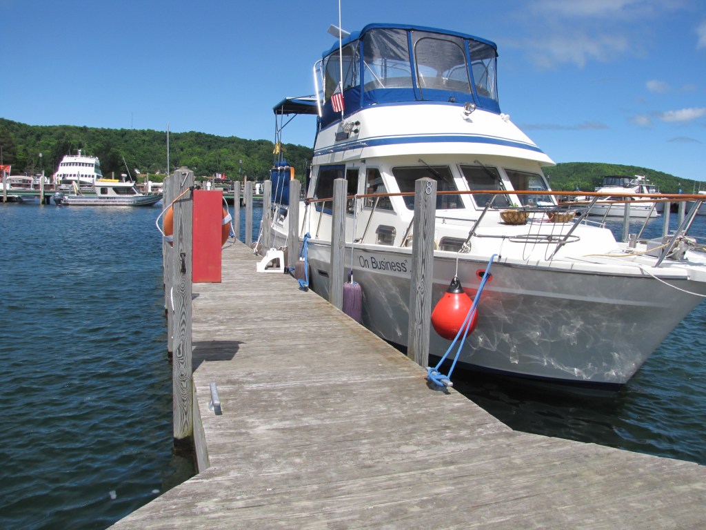 The L-shaped dock, had an outside crib and inner dock, because we were uncertain of the depth inside- we tied up to the outside of the crib, tying our lines around the wooden structure and lag bolts. Even though the winds were blowing out on the lake the bay was very sheltered.
