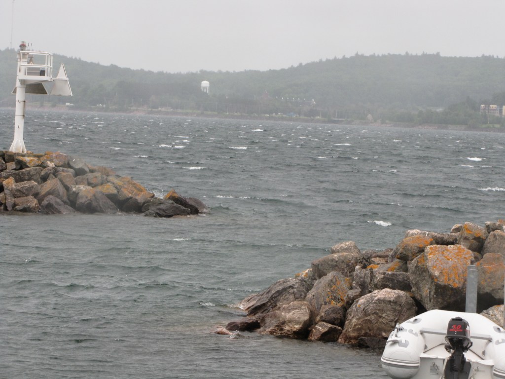 On Tuesday morning, Andy helped Tim clean up the sauna area, and then they burnt some boxes. Just a small fire. Around noon, it was time to take off and head to Thunder Bay, with the wind and waves, still coming from the East, there was still some big waves out in the Bay. We followed Knot Today, through the Thompson Island gap, and waves were a little less on the other side, we continued on passing by Pie Island. A couple of times, Knot Today, slowed down, so they could bail out their dinghy which was filling up with water. As we approached Tbay, we could see the sleeping giant, once we were through the break wall, the grain elevators were all visible on shore, many of them with names on them- that no longer exist- like Agricore United.