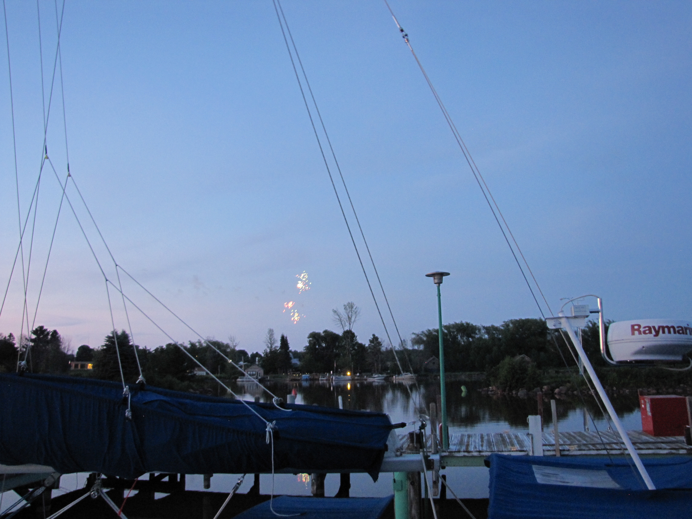 We arrived at the marina, and called in to customs again to let them know we had landed in Tbay. The women that Andy talked to said that it wasn’t necessary to call in again, as we had on Saturday—he thanked her and hung up. We got our slip assignment, which was next to some sailboats, and we tied up and plugged in to power. I went up to the marina office and checked out the wash machines, and later went back for a shower.