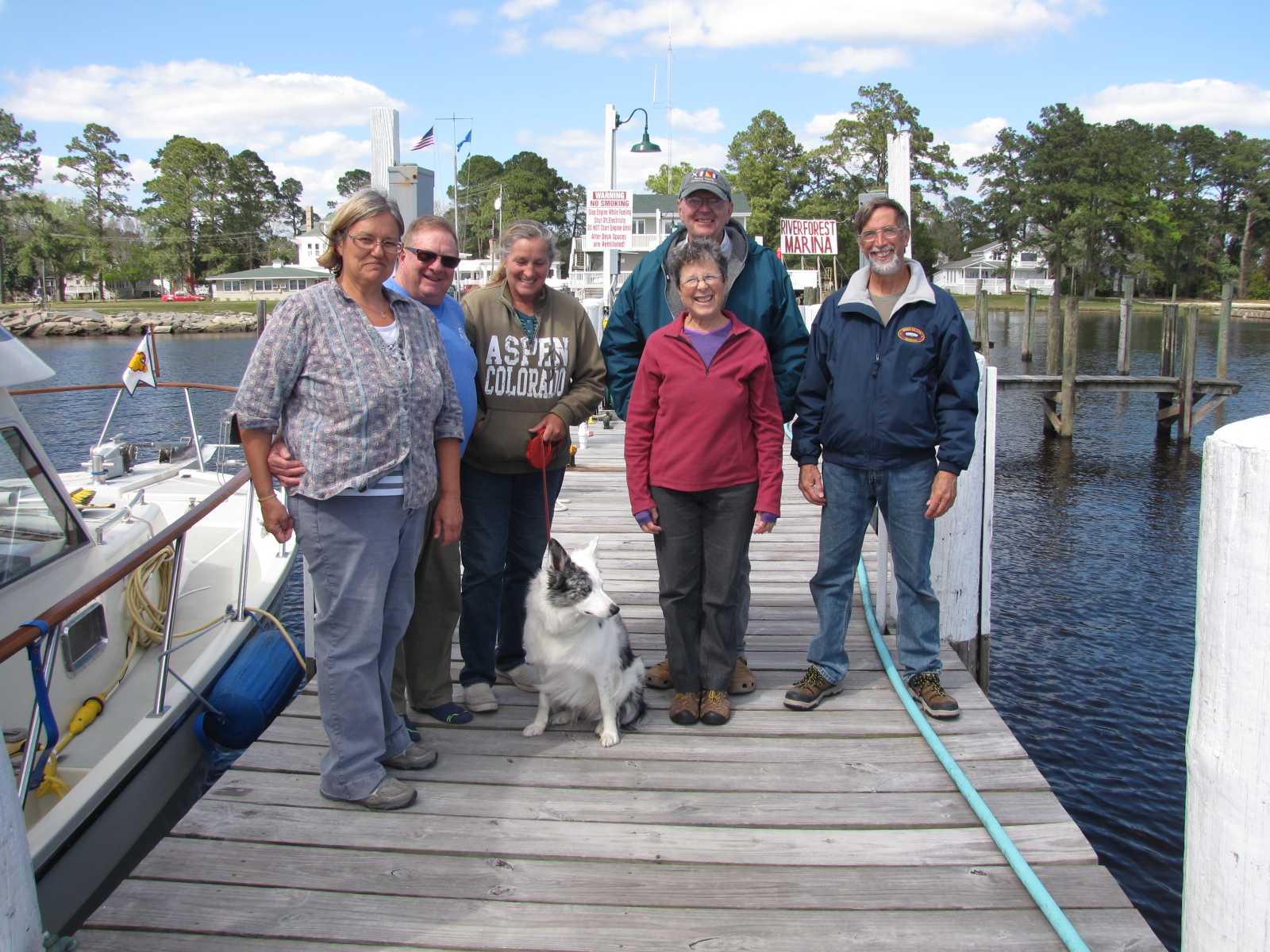 In the afternoon we were surprised by 4 of our boating friends & Pearl (Wally&Darcy, Shannon & Pearl and Brian) had come to Belhaven from Dowry Creek so Larry could go to the dentist, saw “On Business” tied up at River Forest and knocked on our door. They are all waiting out the winds at their marina. We had a good visit and learned that boats which had ventured out into the Alligator River had encountered high waves and winds earlier in the day. All the more reason to stay put.