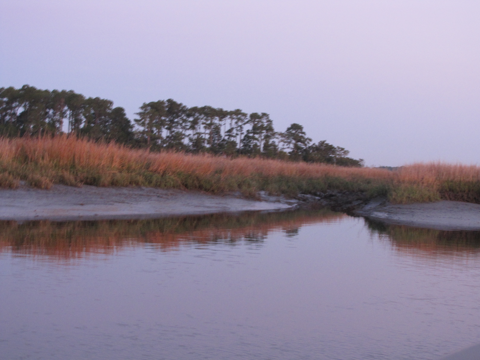 The captain says “depending on your perspective- we were either chased by a nuclear sub or led it to it’s home base” . We went another 10 miles north and ended up anchoring in Shellbine Creek at 3:00, at low tide in 8.4 feet of water, several hours later when high tide hit we were in 15.8 feet of water. The landscape looks quite different depending on how much water is around. At our anchorage we were visited by a pod of dolphins, Andy counted at least 11 that were happily swimming around and snorting.