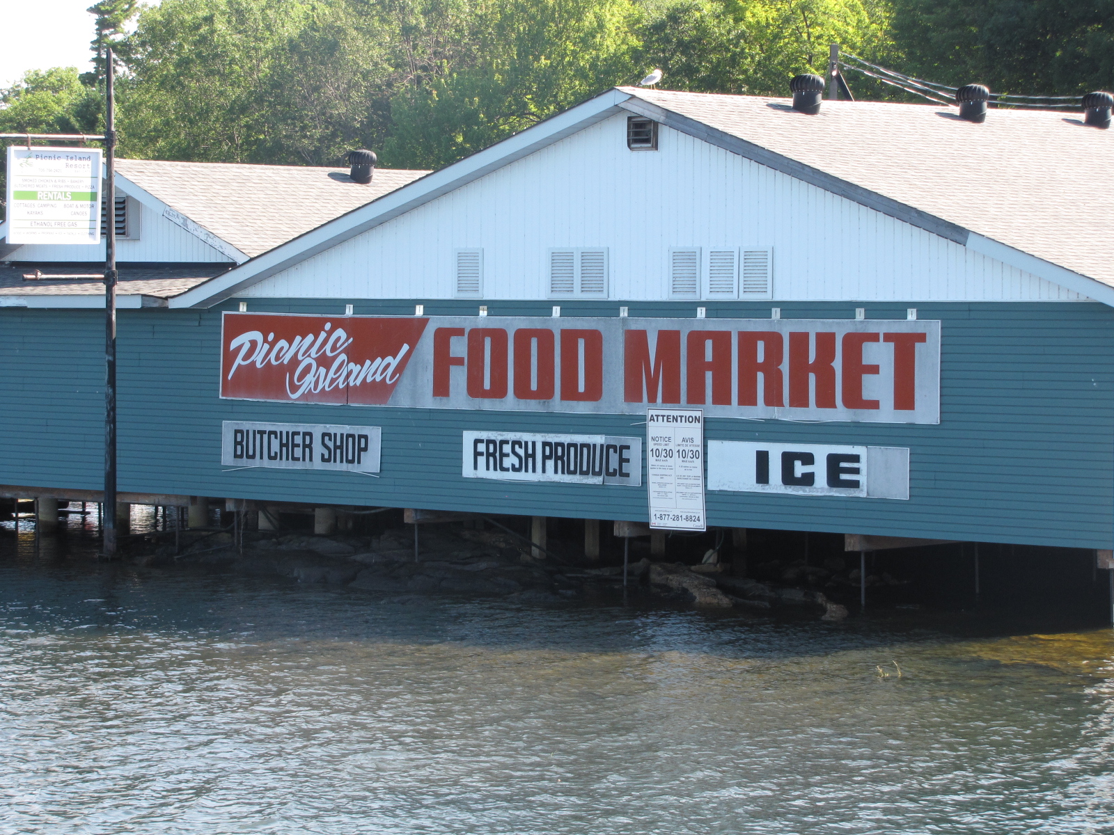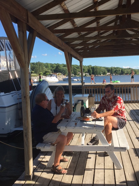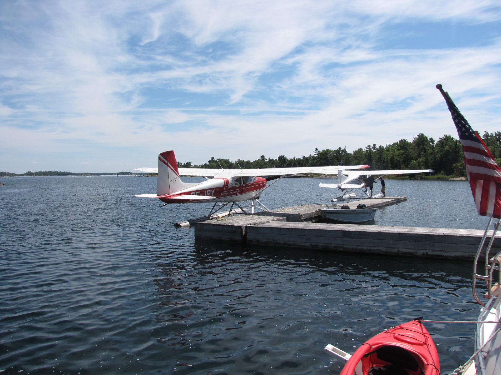 Once the gas docks opened we moved the boat and filled up and pumped out.  We then set off north and west across Hogs Bay and Severn Sound to the main channel.  We went by Picnic IslandIMG_8681and Honey harbor and north of Beausolei Island.  We then got into the Muskoka landing channel and followed it into Big David Bay and then into the O’Donnell channel.  At O’Donnel, there are 3 Parks Canada islands where we saw lots of people sunbathing and swimming amongst  the rocks.IMG_8693We continued on towards  San Souci and frying pan  islands,.  The plan was to meet Stillwaters II and another looper boat  at Henry’s for supper and  stay the night this was about a 40 mile trip.    Henry’s is  accessible by boat or plane,  dockage and power are provided to boaters for a fee.IMG_8697 IMG_8700