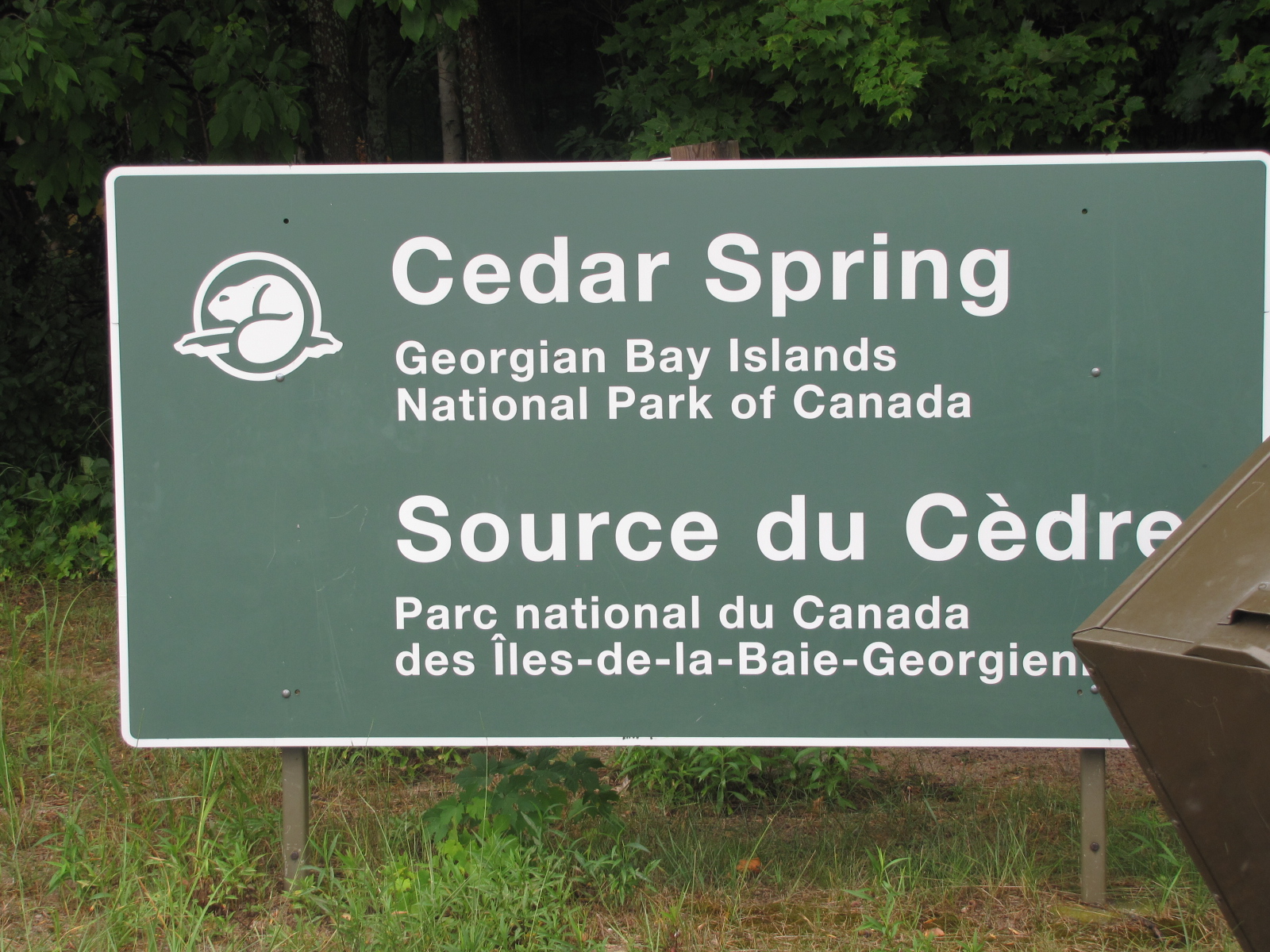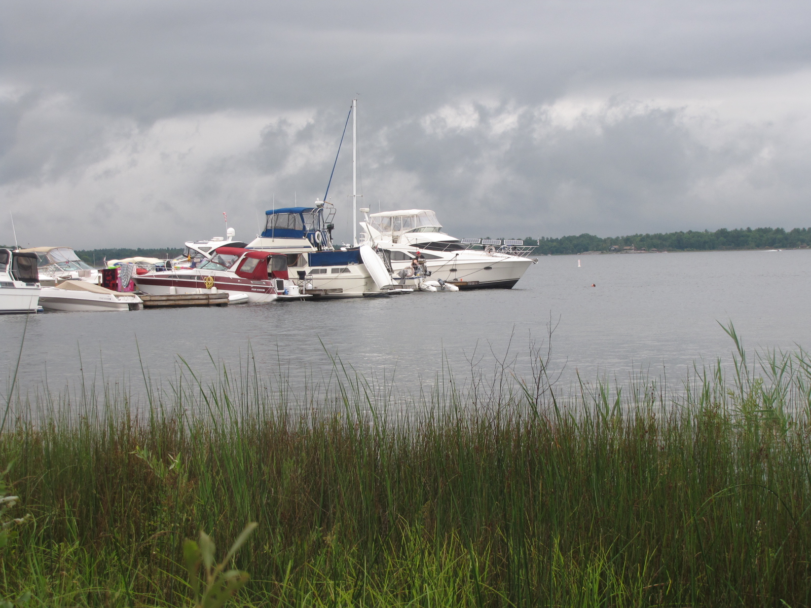 When we  got up the captain found that his pickerel rig which he had set seemed to be under the boat.  However he couldn’t pull it up, so the captain had to dive under the boat to retrieve the fish and the line around the strut.  He’ll do anything for fish!!   It was another Bass.IMG_8821It did  rain through the night, it seemed to stop  somewhat so we weighed anchorage at 9:30 Saturday morning.    After  the Monument channel we followed the Muskoka and main channels.  We  checked out Frying pan bay on Beausoleil islandIMG_8829just when the rain was starting again, but there was no space available at the docks,IMG_8828so we continued on.    We went by Picnic island and turned into Beausoleil Bay and went to the dock at Cedar Spring.IMG_8831 IMG_8832     As we tried to dock the wind picked up, so luckily there were several people that helped us tie up.  We checked in and after the rain stopped, we went for a  short walk.   People came out from other boats to swim, but there were some ominous clouds across the bay, and tornado warnings in parts of Ontario.IMG_8833