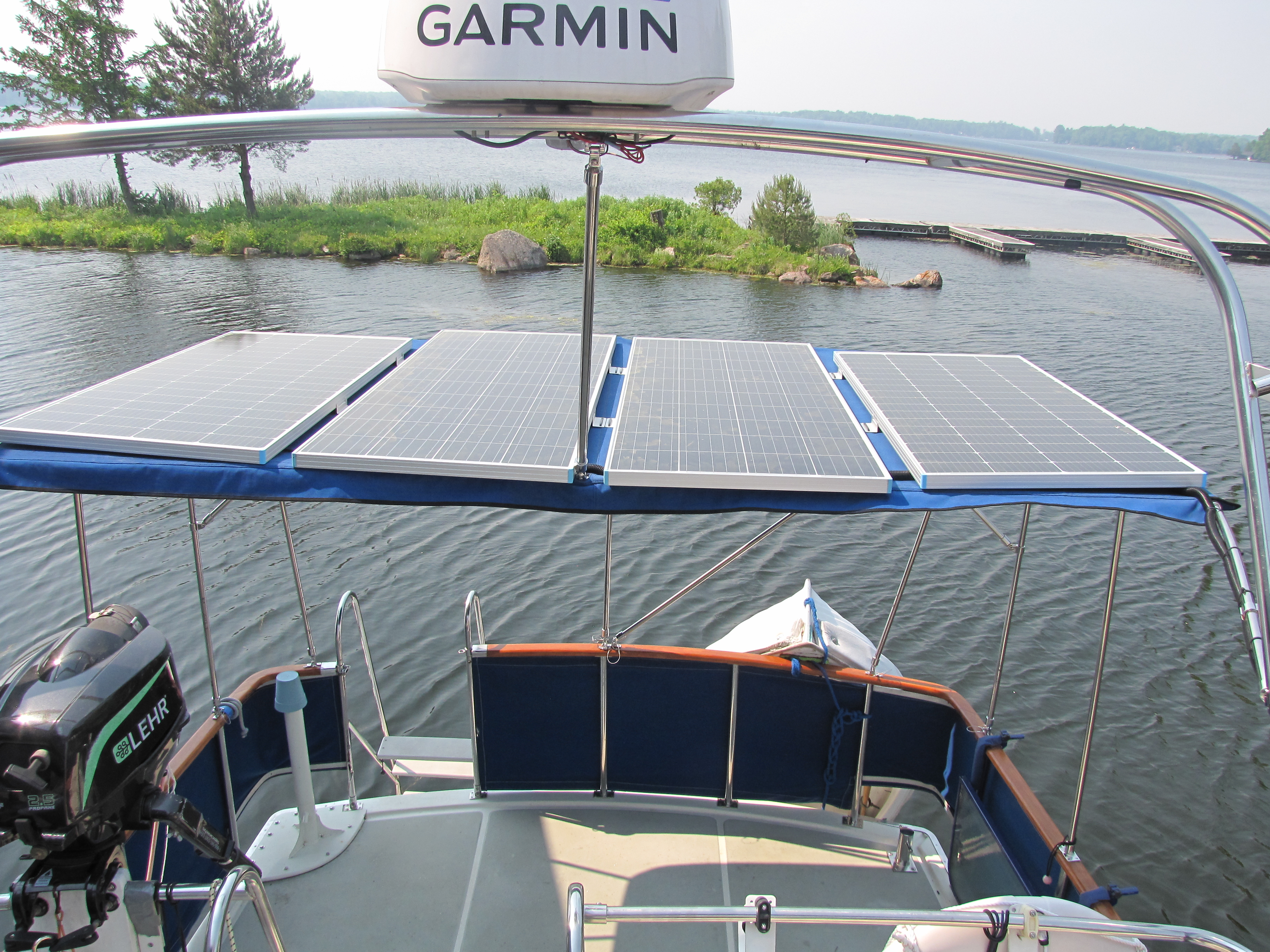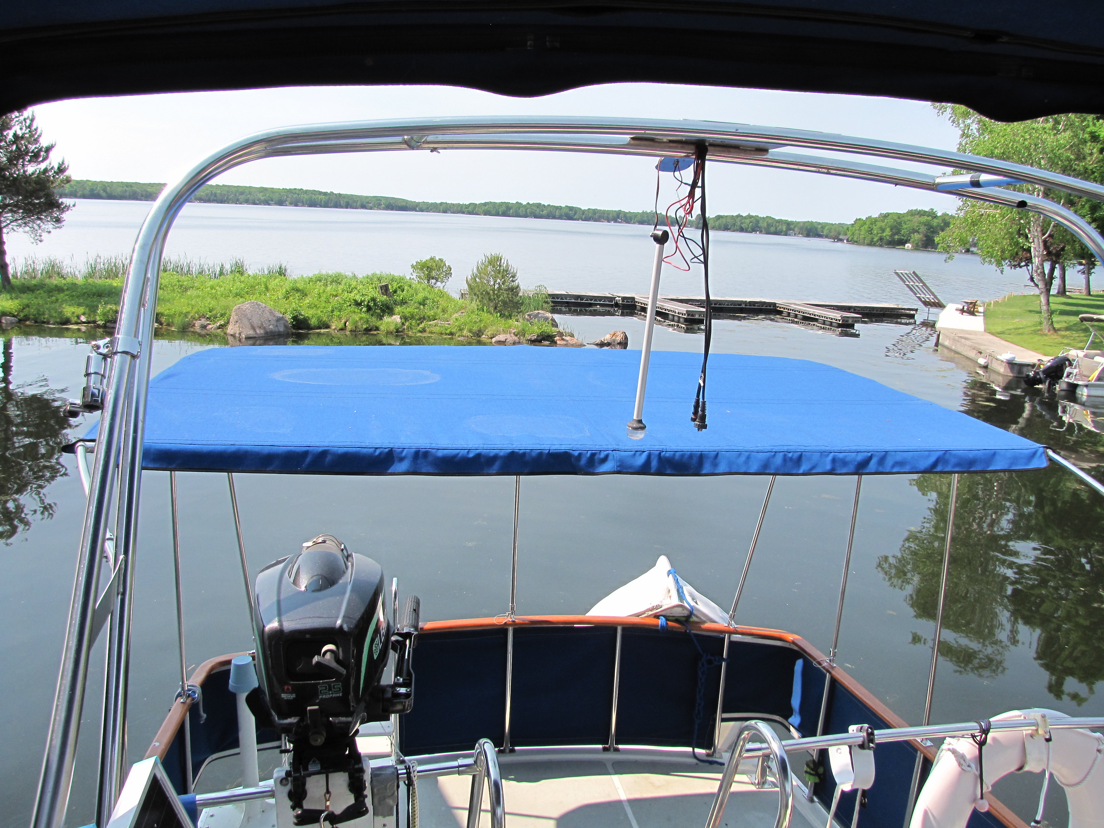 We spent our first night in Wawa, long day, we had left the house shortly after 5:00, and with the exception of stopping for gas, Andy drove 13 hours arriving at the motel just before 7:00 p.m. The next morning, we left around 7:30 and stopped in the Sault for breakfast and gas. Then it was on to Parry Sound for more gas, and then across country to Brian and Helen’s in Bancroft. Andy had heard from the marina on Thursday, and we knew our boat was in the water, however none of the upgrades ( Lithium batteries, more solar, and monitors ) was complete. We drove up to the boat on Saturday and saw that the canopy over the sundeck was done. It looked really good; this canopy will be the support system for our four solar panels. We unloaded the car, our one issue on Saturday was that the boat fridge didn’t seem to be working even though we were plugged in to shore power. We came back to Bancroft to spend another night. We returned to the boat, and by hooking up the batteries, the fridge would run on D/C power so that was great, as fixing the fridge would likely take weeks, and a replacement could be months.